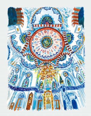 デザインの基本は、トルコのモスク文化の最盛期である16〜17世紀のオスマン・トルコ様式で、外観を印象づけるドーム屋根はその顕著な特徴のひとつ。なかでもひときわ大きく背の高いドームの内部が、建築の中心をなす空間=礼拝堂だ。