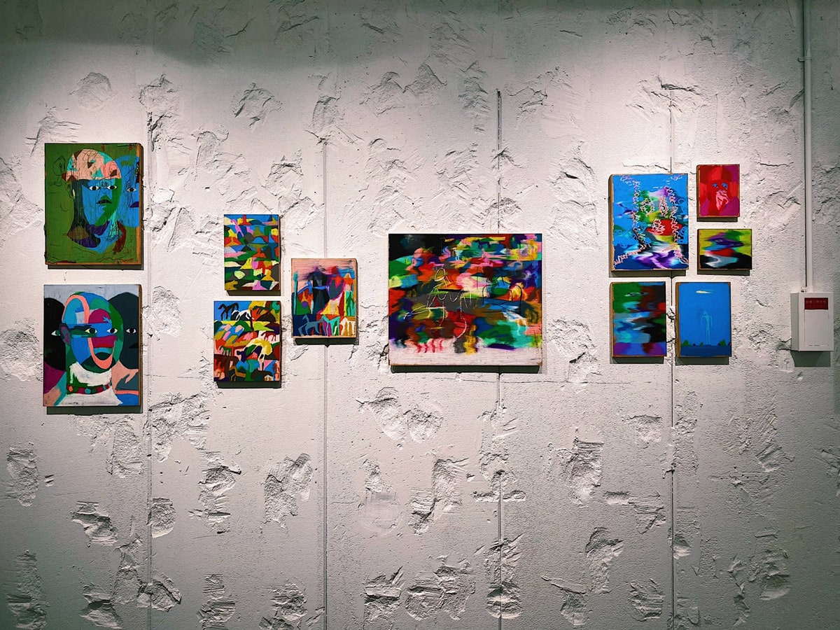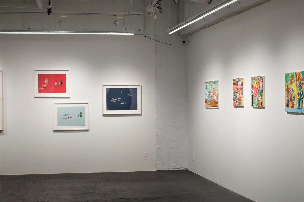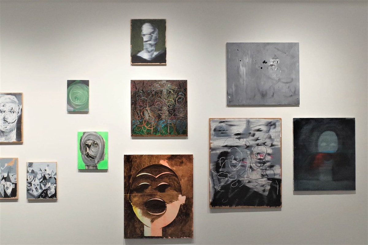 本展は、2018年の横須賀美術館以来、3年ぶり5度目の個展となる。会場には自宅やスタジオ、ギャラリーで保管されていた未発表の作品およそ50点が展示されている。大小さまざまなサイズのパネルやカンバスに、モチーフも色使いも異なるペインティングがずらり。タイトルのとおり、描かれている人?のようなものの顔が全部こちらを見ている壁は、イラストやマンガのキャラクターのようなかわいらしい顔とポップな色が楽しい作品だ。
