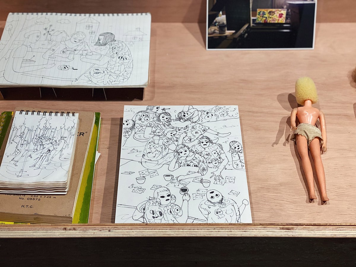 4階には、これまた発表された作品以上に膨大な量があるというドローイングブックからセレクトされた数点と共に、アーティストの中村土光がアーティストのインタビュー映像を集めたプロジェクト「誰かのCV 2014」より、中園のインタビュー映像が流れている。絵が得意だったから自分は絵で表現している、とか、気分が乗っているときはモノクロが多くて、少し暗い気分のときは明るい色になる、など、素直に答える作家の姿から、この人は絵を描くのが好きなんだなあと伝わってくる。ちなみに、インタビュー動画は以下のウェブサイトでも見ることができる。