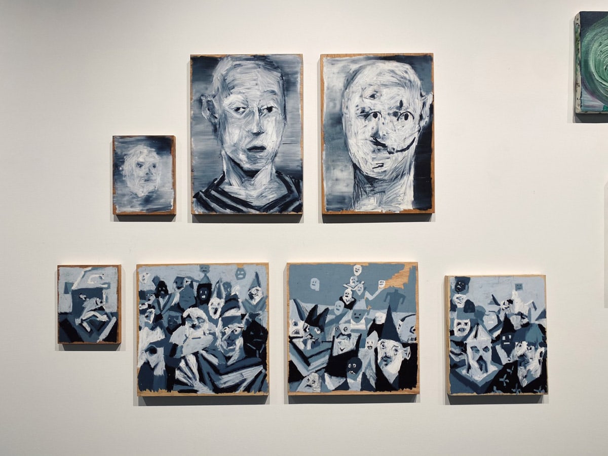 一方、モノクロに近い少ない色数で描かれた作品は、顔の部分の絵具がぐにゃりと引き伸ばされ、やや不気味な雰囲気を醸している。かと思うと、計算されたかのように細密に描かれた作品もある。