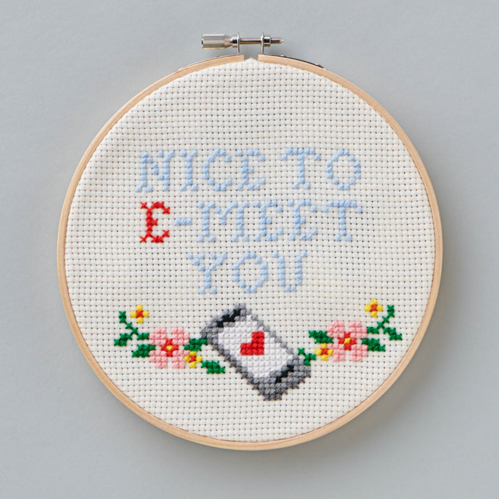 ハロー、ハロー。GINZA刺繍英会話教室の開講です! ビジネスシーンから友人との会話まで、知っていたらタメになる英語フレーズをオリジナルデザインのクロスステッチ刺繍と一緒に楽しく学ぶ新連載。第1回は、デジタルでのやりとりが増えた今の時代にユースフルなフレーズをご紹介。