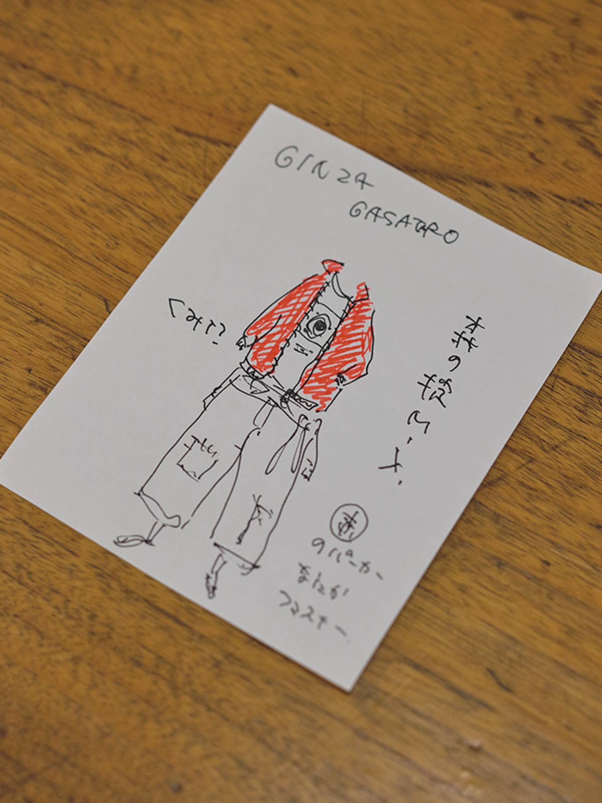 『GINZA』2022年12月号の撮影前、伊賀さんから編集部に送られてきた《森の掟》モチーフの直筆ラフ。太郎愛あふれたアイデアで今回のコーディネートを考案してくれた。