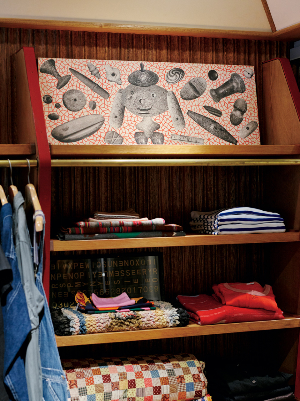 店内にはさまざまな国で見つけたフォークアート、アウトサイダーアートのコレクションと共に、小林真さんの作品もレイアウトしています。お気に入りは彼の20代の時の作品。ギャラリーがオープンしたタイミングで譲ってもらいました。本人曰く「古本屋で集めていた古い発掘品の資料を片っ端からコピーして、コラージュしたもの。考古学的な真面目な感じがするので、それとは真逆のポップで可愛いミッキーマウスっぽいものにしてみようと思った」。他にも、神宮前のファセッタズムがオープンした時の壁一面のコラージュは素晴らしかったですね。