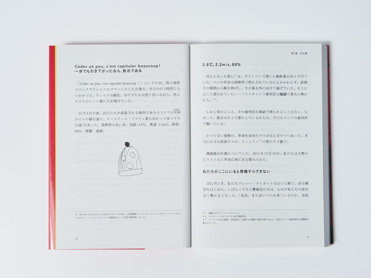 カラフルなワンピースとタイツを身につけ、バラクラバ(目出し帽)をかぶったアイコニックな姿で、反プーチンを唱える過激なゲリラ・パフォーマンスを主な活動としていた彼女たち。世界的な注目を集めるきっかけとなったのは、2012年2月21日に、モスクワの大聖堂で「聖母マリヤ様 プーチンを追い払って!」と叫んだアクション(彼女たちは自分たちの「活動」をこう呼んでいる)でした。敬虔な信者たちからヒステリックな反応が起こったのはもちろん、このことが原因で逮捕され、マーシャとナージャはこういった行為の代償としては異例とも言える2年の実刑判決を求刑されました。本書では逮捕直前の逃亡劇、不条理なコントのような裁判の様子、世界屈指の劣悪な環境と言われるロシアの刑務所での囚人生活について、ジャーナリズムと詩を学んだマーシャが独特の語り口でその実情を明かします。そして、刑務所内での受刑者たちのあまりにひどい生活環境、女性差別、管理側の不正を目にした彼女は、次第に人権擁護活動に目覚めてゆくのです。