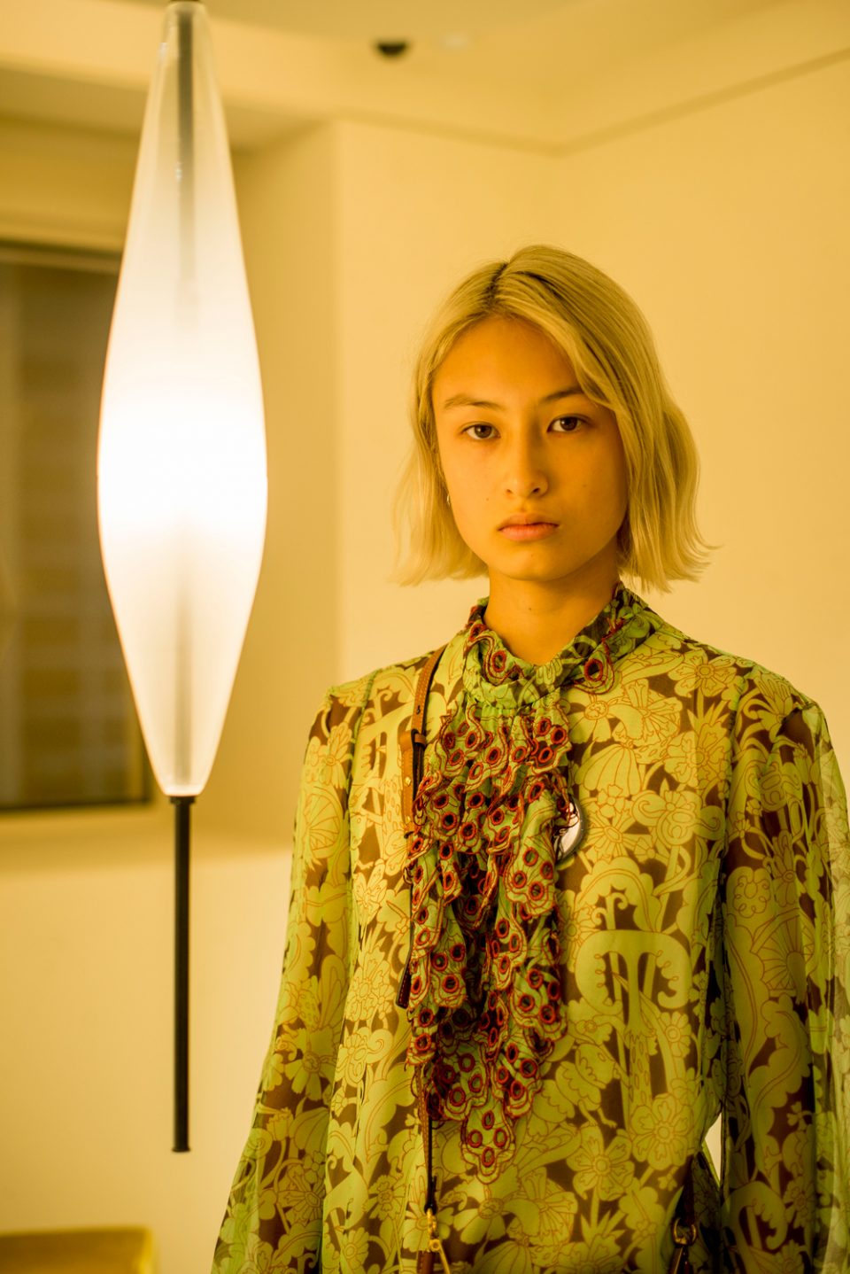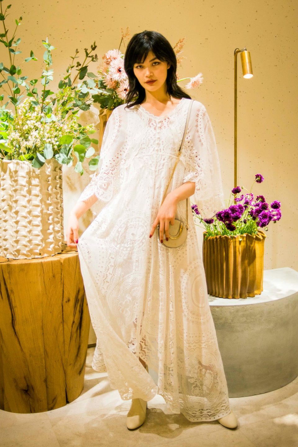 話題のニューカマー、モデルのアユミターンブルさんが着こなすのはワンダーランドプリントのシルクオーガンジードレス。