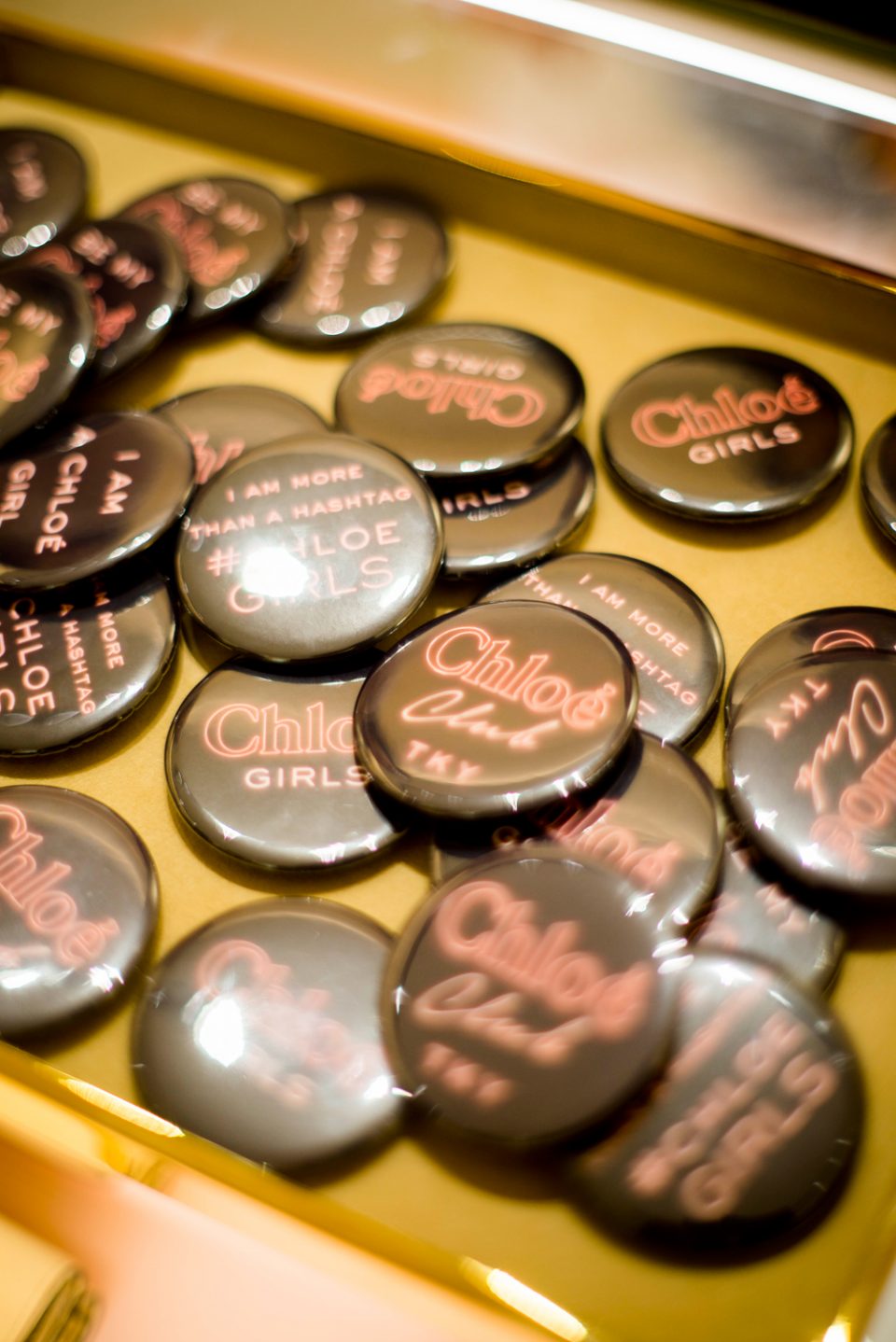 中央通りを歩くとライトアップされた美しいファサードが目に止まります。このファサードはメゾンに採用されている3Dウォールをメッシュ加工したもの。まばゆい光に吸い寄せられるように入場すると「クロエガールズ」や「クロエクラブ」などと描かれたグラフィカルなオリジナルバッチのプレゼントが。