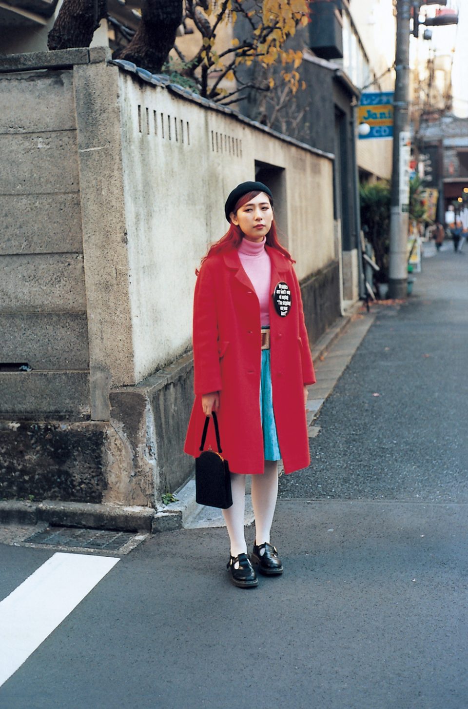 Coat, Knit, Skirt: 〈ヘイトアンドアシュバリー〉で購入した古着 Beret: 父親からもらったもの Shoes: ドクターマーチン Bag: ヴィンテージ