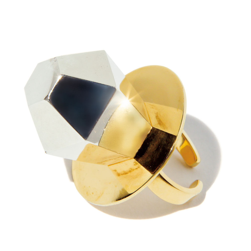 おしゃぶりキャンディがシルバー×ゴールドのハイエンドなリングに大変身。それにしてもピッカピカのメタル製になる日が来るとは思ってもみなかった。サイズはちょっぴり大きめ。中指に1個づけしてこのウィットを楽しみたい。