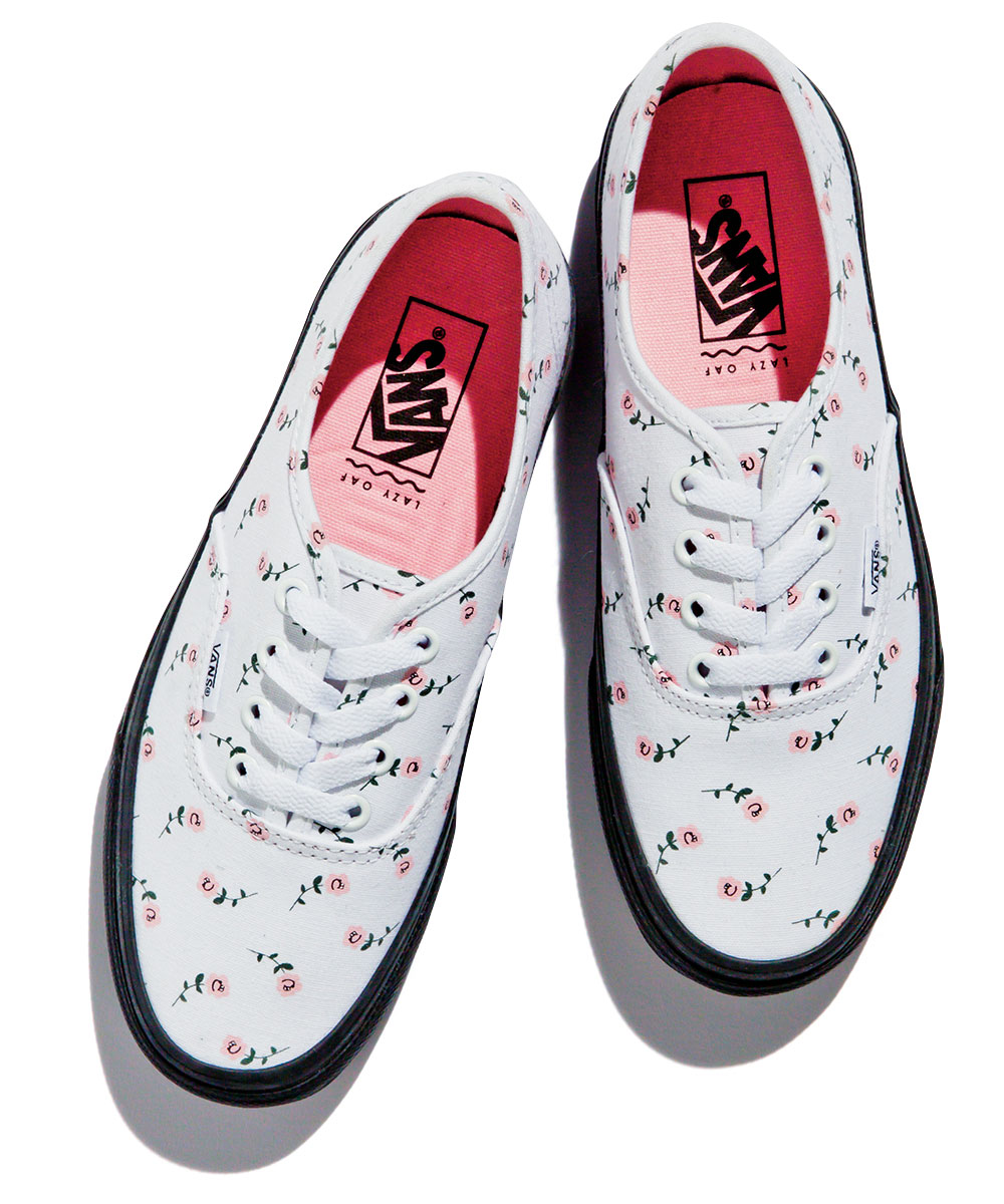 英国の脱力系ブランド〈レイジーオーフ〉とコラボして、いつものオーセンティックがこんなにポップになっちゃった。ちょっと足りてない感じのバラらしきフラワープリントがゆる〜くてグッド。インソールと踵のロゴがピンクなのは自慢できる。