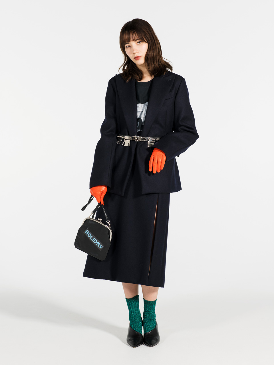 感が冴え渡る水曜日。経理部のACOとして、社内皆様の自由と平等を守るため領収書のチェックは怠りません。時には仕事に集中すべく、目立たぬように全身をブラックで統一する日も。そこへハロウィン色のグローブ、グリーンのラメソックス、〈ザ・ダラス〉のメタルフリンジベルトでさり気ないアクセントを少し。ACOの場合、「チェックが細かい」「嫌な経理だ」とネガキャンをはる人ほど、戦いを挑んでいるとみなします。