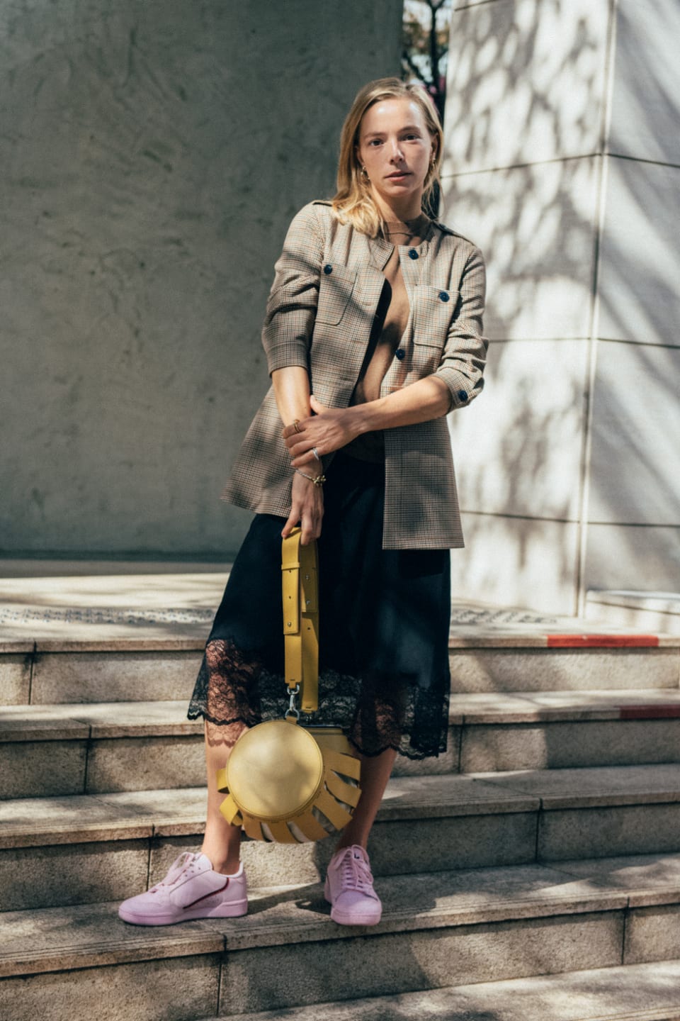この日、シャルロットが着用していたジャケットは〈A.P.C(アー・ペー・セー)〉、ニットは〈Alexandra Golovanoff(アレクサンドラ・ゴロヴァノフ)〉、スカートとバッグは〈Paco Rabanne(パコラバンヌ)〉、スニーカーは〈Adidas Oliginals(アディダスオリジナルズ)〉、アクセサリーは全て〈シャルロット シェネ〉。※全て私物