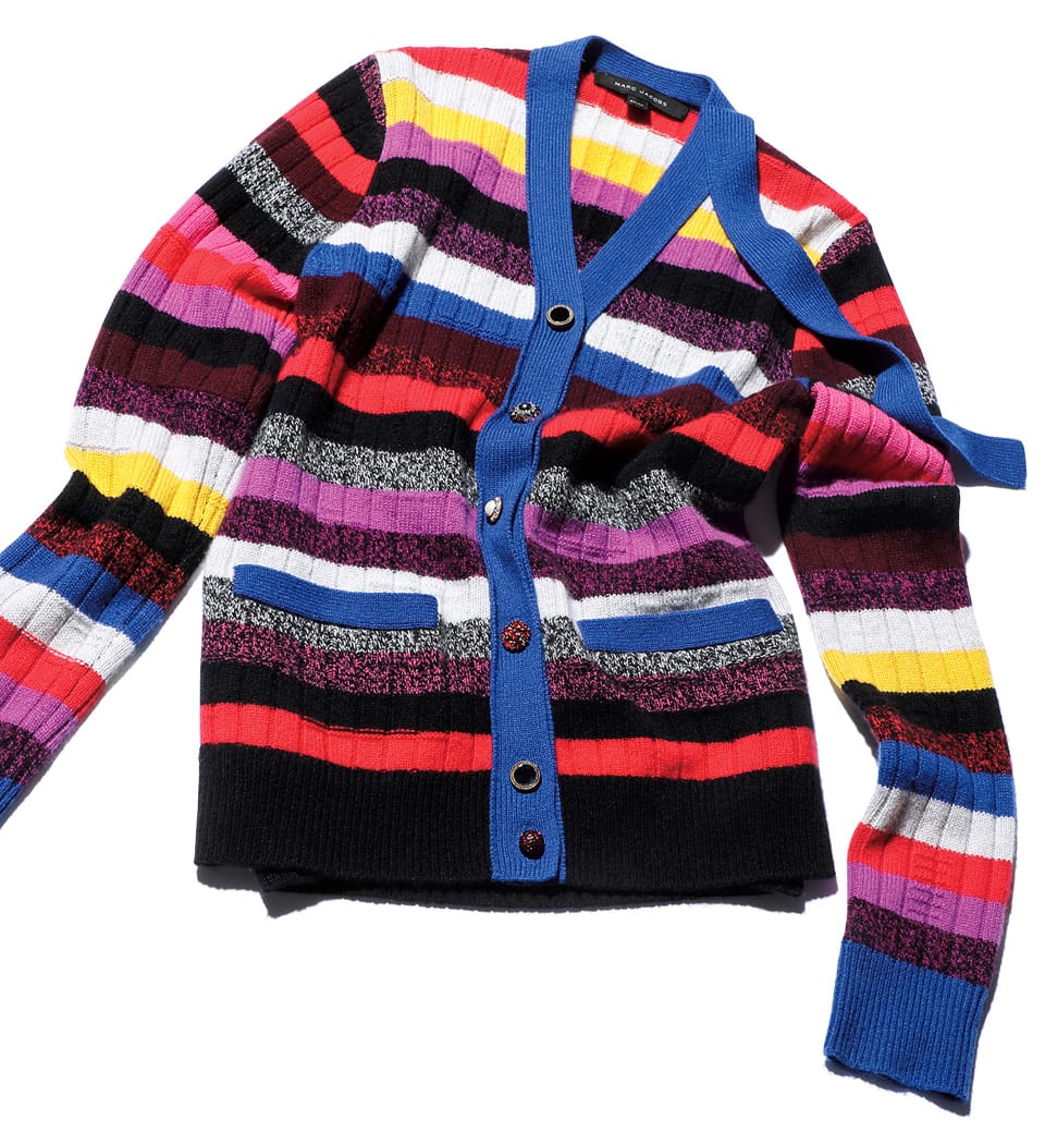 マークのお家芸は、ずばりポップで品があること。エネルギッシュな色合いのボーダーにメランジュの糸を編み込んだり、5種類のビジュー風ボタンをつけたり何かと楽しませてくれる。首元のぴらっもご愛嬌。