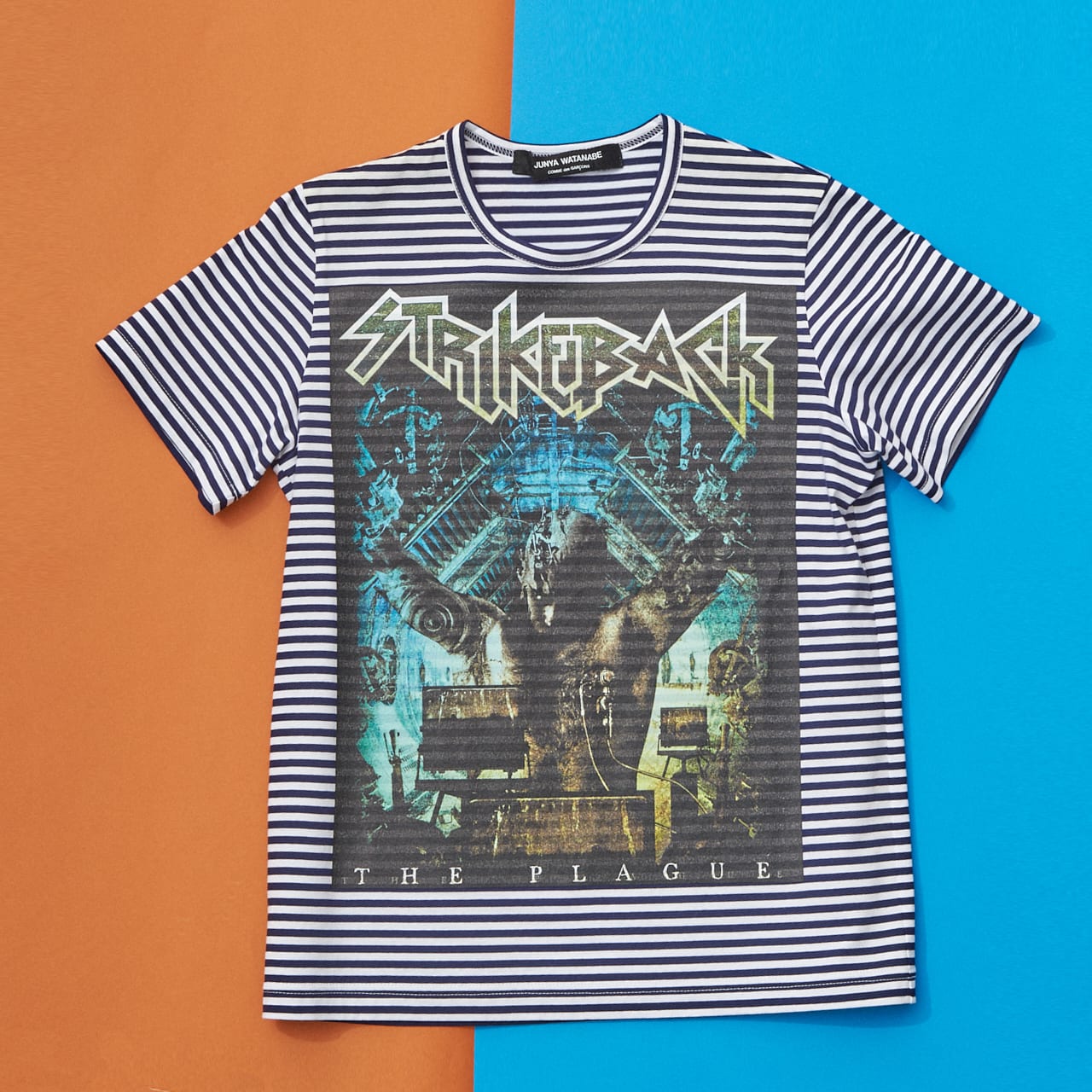 実在するバンドTHE PLAGUEのビジュアルを、ボーダーTシャツにオン。ボーダー×ヘビメタって、ありそでなかったニューなロックの組み合わせ。 ¥20,000(ジュンヤ ワタナベ・コム デ ギャルソン|コム デ ギャルソン ☎︎03-3486-7611)