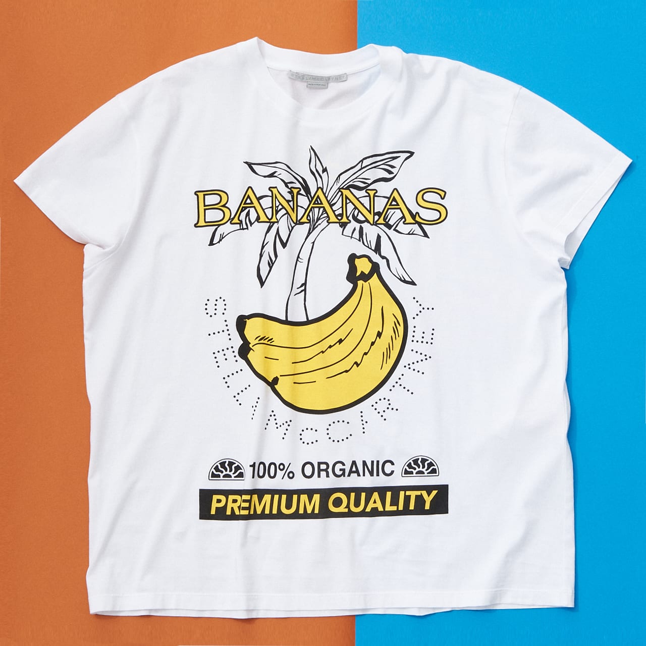 「PREMIUM QUALITY」バナナに貼られた果物シールがデザインソース?コンパクトな袖の作りで一味違うシルエットに。 ¥48,000(ステラ マッカートニー|ステラ マッカートニー カスタマーサービス ☎︎03-4579-6139)