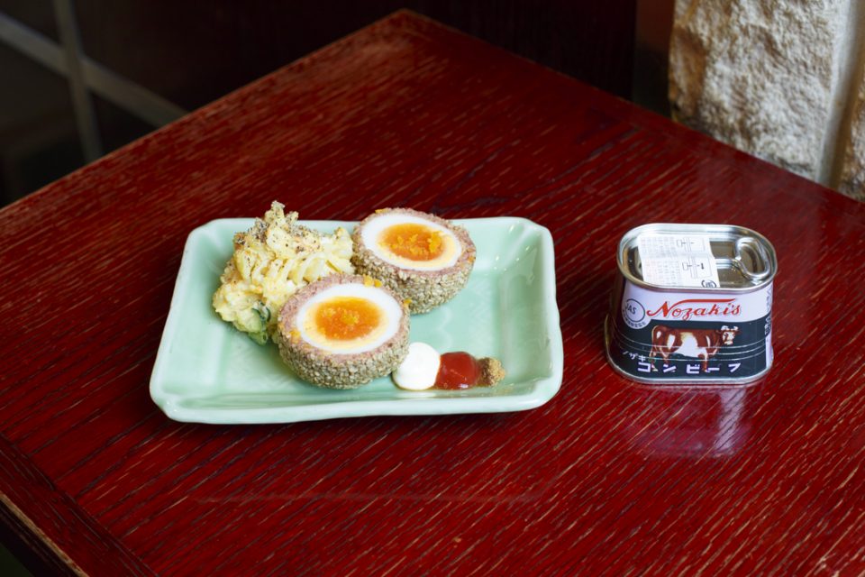 スコットランドの郷土料理「スコッチエッグ」をイメージしてアレンジ。「ノザキのコンビーフ」にマヨネーズとケチャップを和えてパテを作る。パテを板状に伸ばして、ゆで玉子を包み、白ごまをまぶすだけ。付け合わせはマカロニ入りのポテサラ