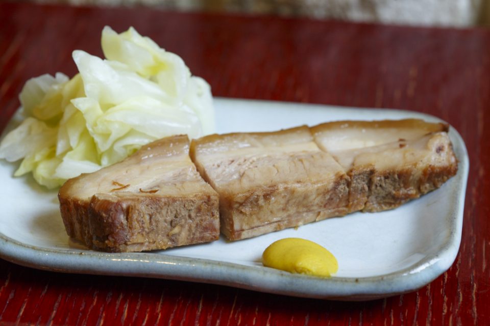 このつまみは、缶詰不使用だが、間口さん渾身の自信作「三枚肉(厚切り)」。使用するのは、間口さんが探し求めてついに出会った、沖縄県安里の市場内にある精肉店から仕入れる皮付きの三枚肉。これを酒と醤油、みりん、五香粉(ウーシャンフェン)を入れて、2時間じっくり煮込んだもの。とろけるおいしさにヤミツキ覚悟。この沖縄豚の生肉を手に入れるために、間口さんはなんと月2回沖縄へ!! お店や仕込みもあるので、毎回の滞在はなんと2~3時間だとか。恐るべし