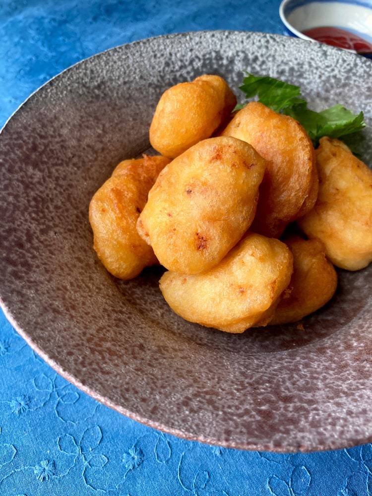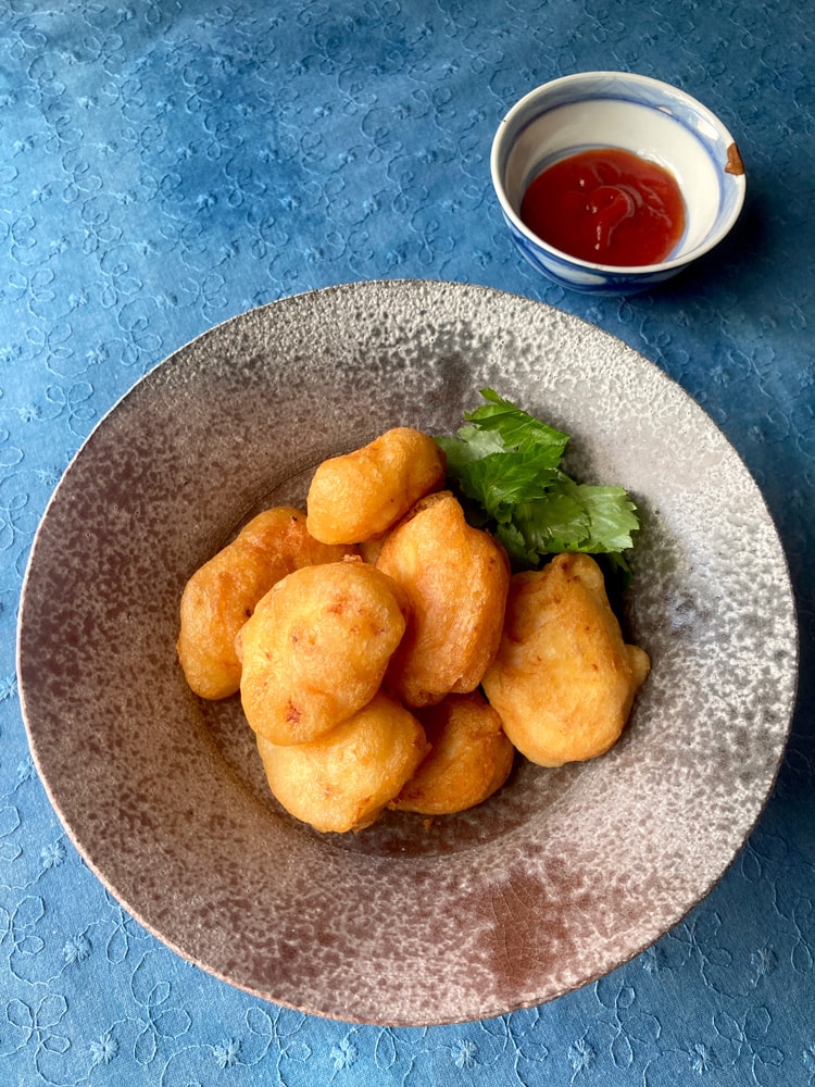 今回、衣に使うのは「米粉」。小麦粉よりもアミノ酸の数値や栄養価が高く、油の吸収率が20%も低いため、とってもヘルシーに仕上がるんだとか。味付けにはケチャップやスイートチリソースをつけたり、カレー粉をふりかけたり。ひと口サイズのとり天は、ナゲット感覚でおやつに食べるのもおすすめ。