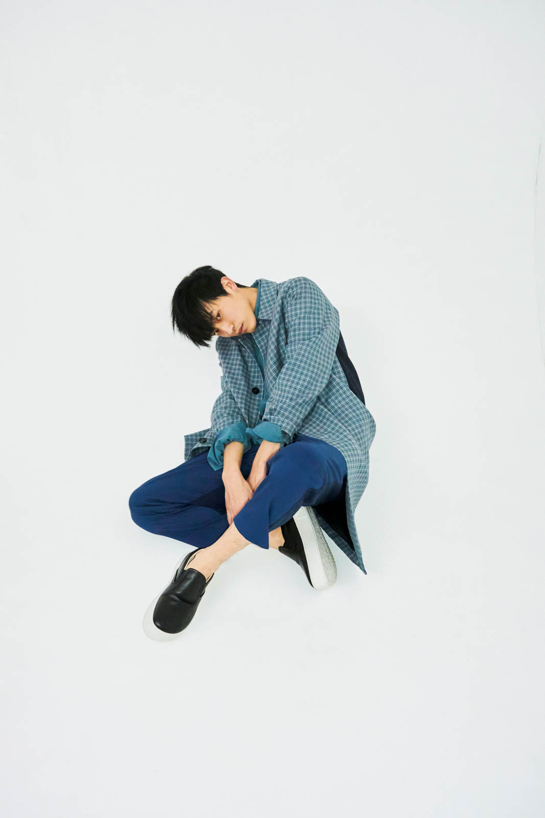「ブルーのグラデーションがいい。今の僕にとって等身大の服ですね」。コート ¥234,300、シャツ ¥85,800、パンツ ¥89,100、シューズ ¥86,900(以上マルニ | マルニ ジャパン クライアントサービス)