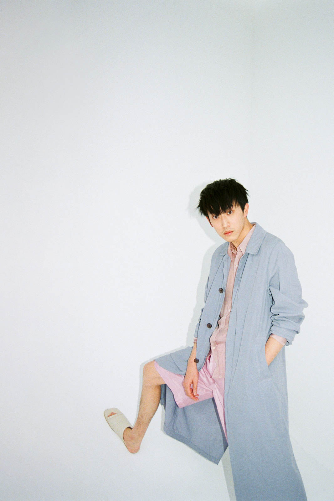 「透け感のあるシャツは少しハードル高いけど、色がきれいですね。このサンダルはすごく可愛い」。コート ¥147,400、シャツ ¥72,600、パンツ ¥77,000、サンダル ¥61,100(以上ドリス ヴァン ノッテン)