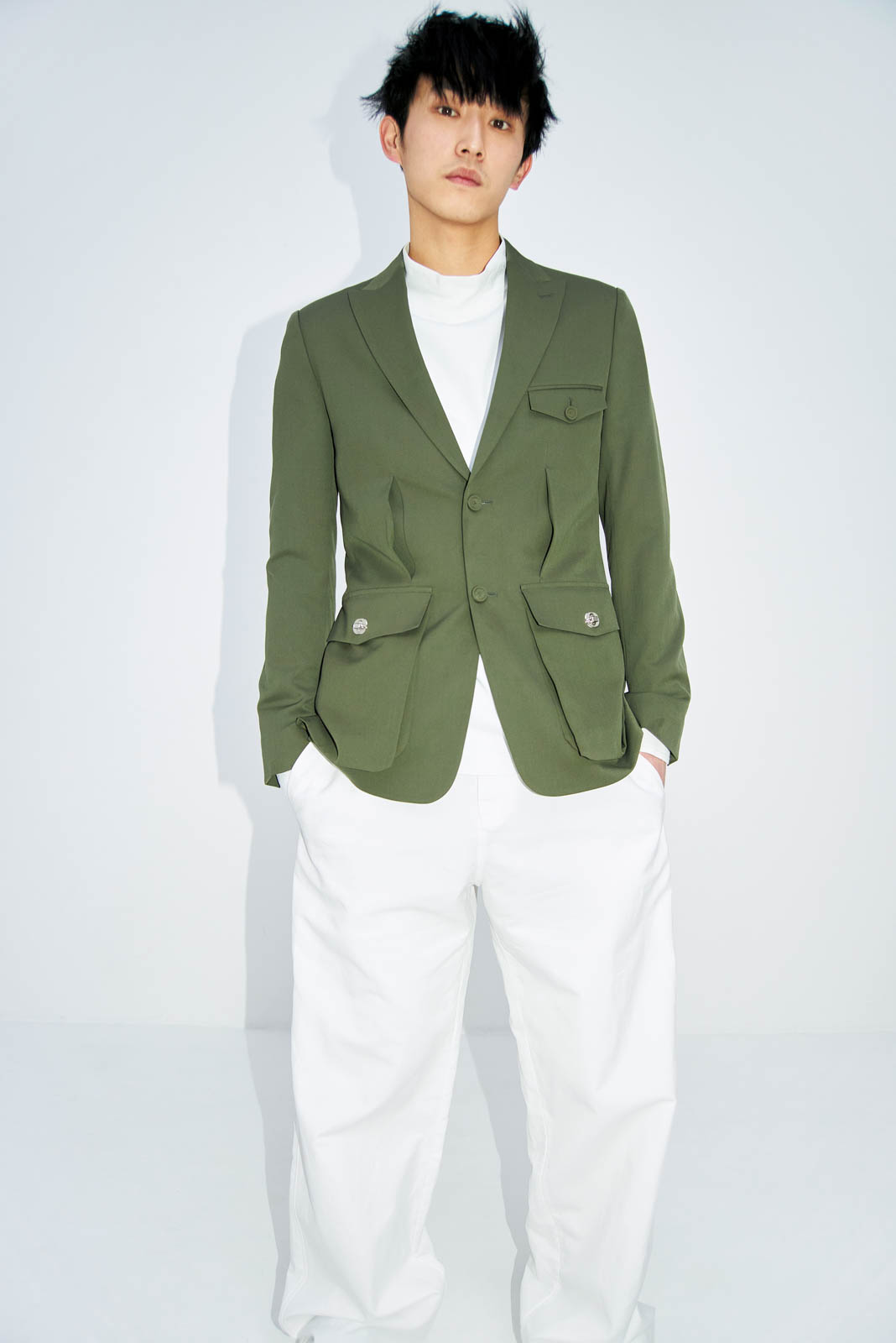 「すごくかっこいい。上質な服に宿るエネルギーを感じます」。ジャケット ¥341,000、パンツ ¥154,000*共に参考価格、ハイネックTシャツ ¥100,100(以上ディオール | クリスチャン ディオール)