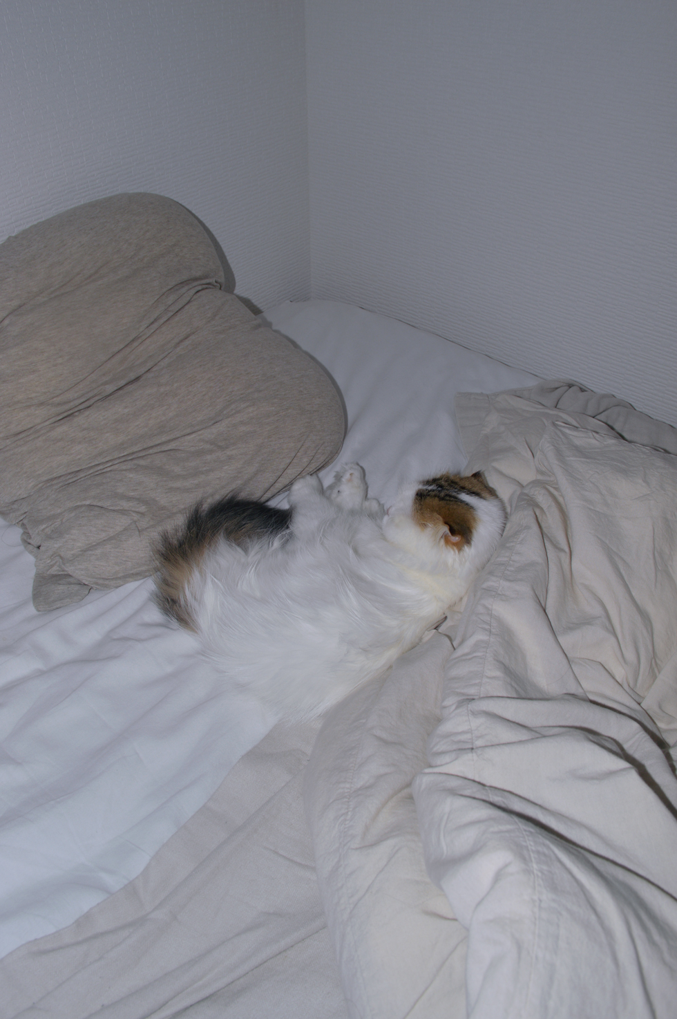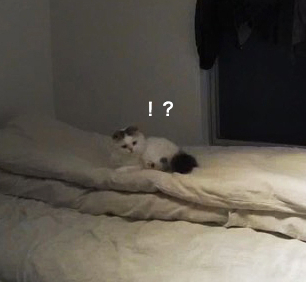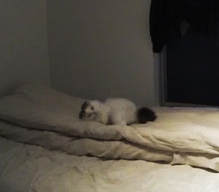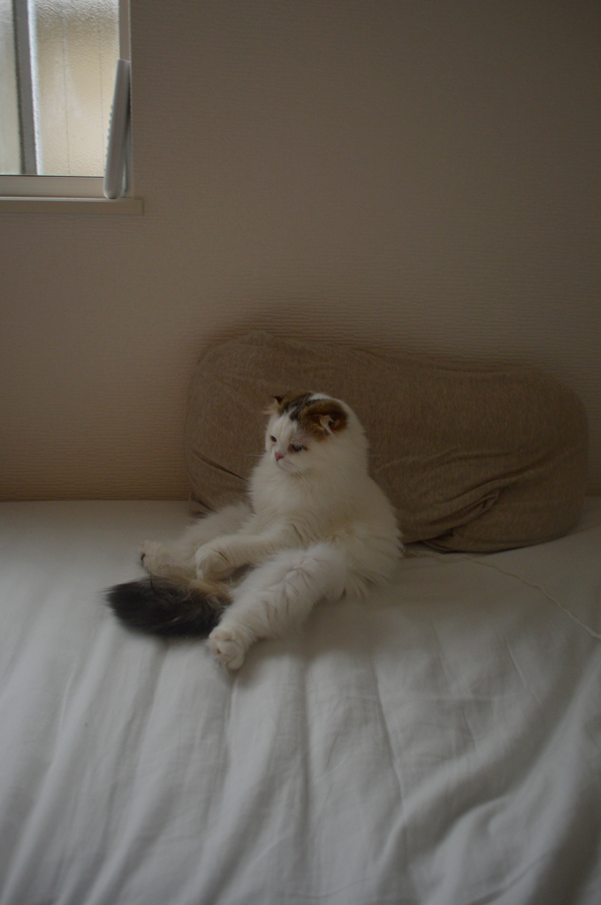 初めて知るお留守番中の愛くるしい姿。つまらなさそうにベッドで転がっている。