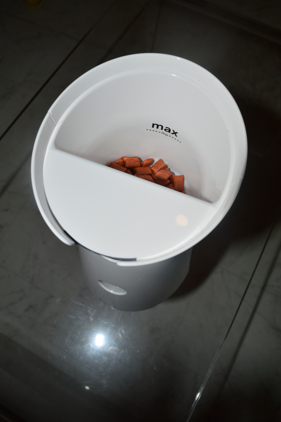 本体のフタを開けて猫用のカリカリを入れてみる。画面下のおやつマークを指でフリックすれば、ボディ部分からおやつがポーンと飛び出す(!)機能付き。家の外に居ながらも、遠隔でマイラバのご機嫌をとることができる。す、スゴイ・・・