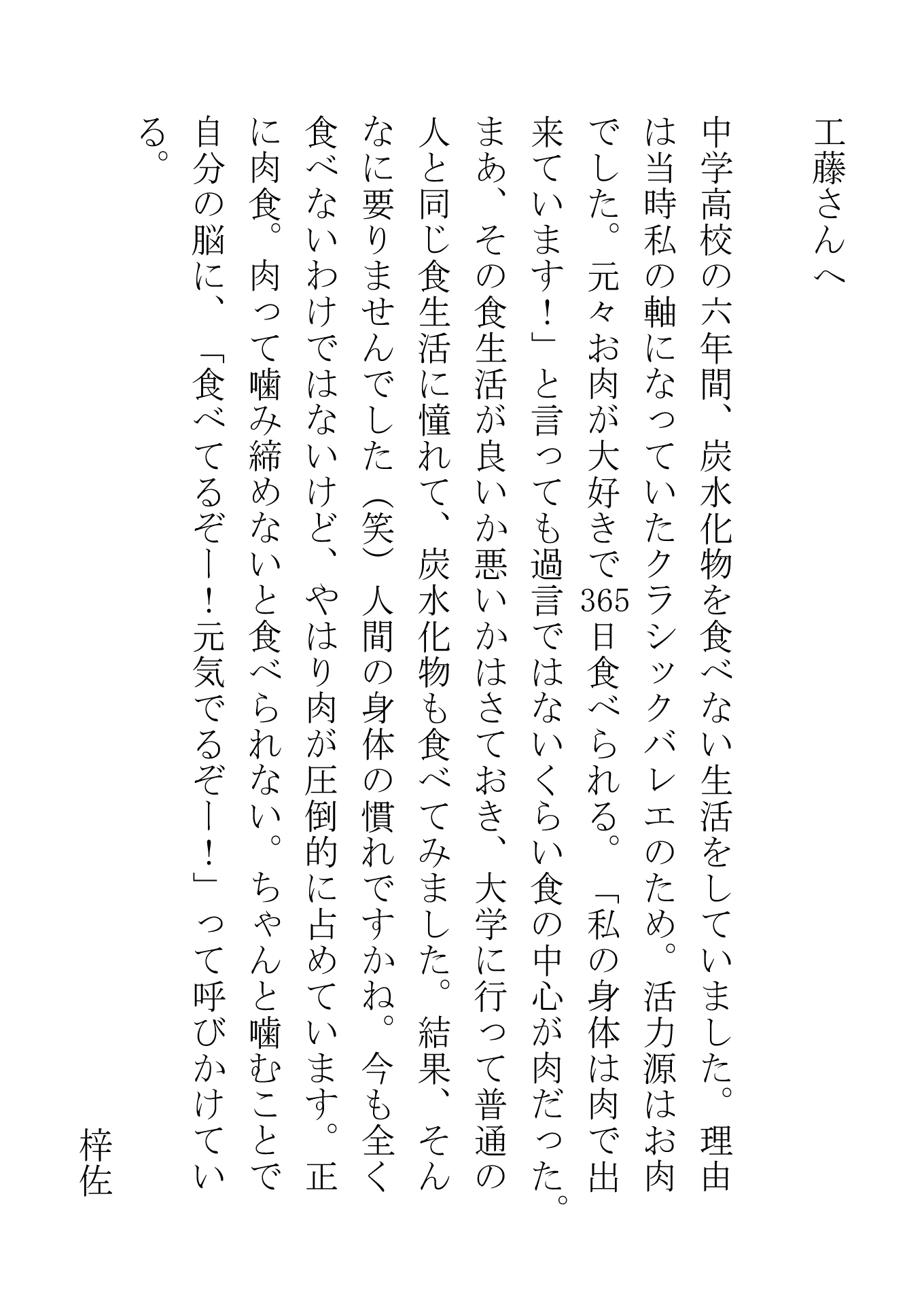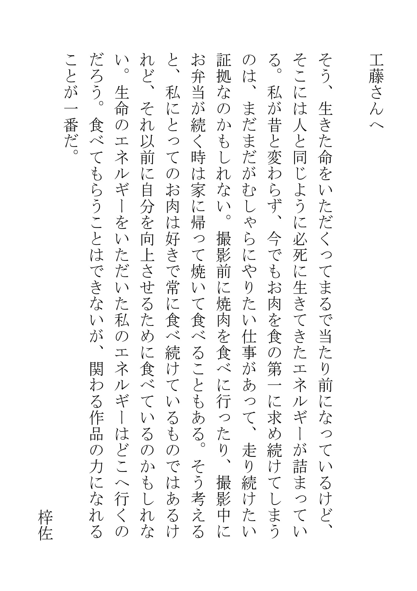 女優 中澤梓佐、写真家 工藤あずさ。東京で出会ったふたりの”あずさ”が写真を撮り、被写体になり、手紙を送りあう。生活においてエネルギー源となる炭水化物や肉。果たしてそこから生み出されるエネルギーはどこへ向かうのか?今日の私が、明日の私のルーツになる。中澤梓佐のルーツを結ぶ十二ヶ月の記録。