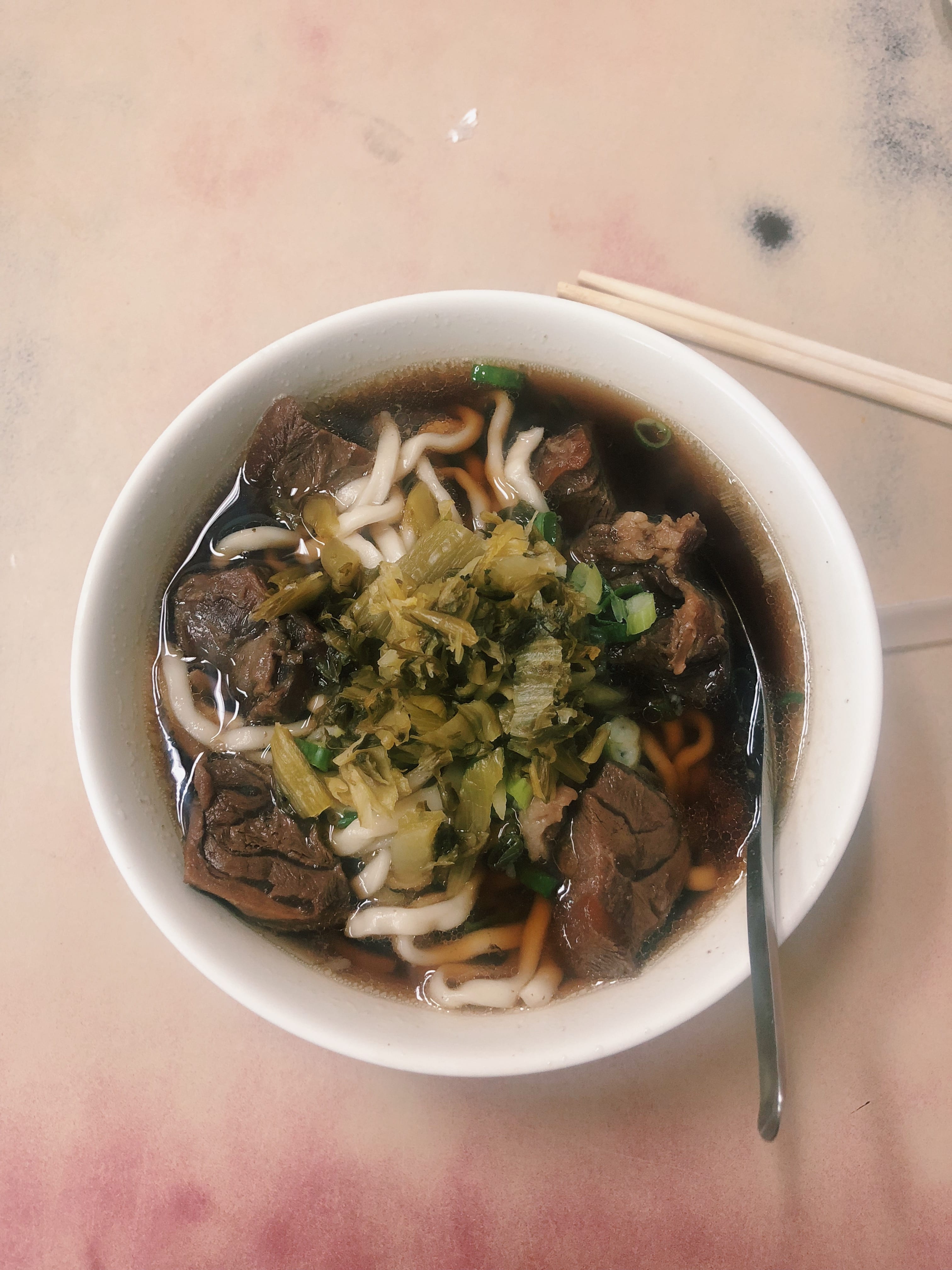 中サイズの100元(約350円)を注文。醬油ベースのスープには台湾のスパイスが効いているのですが、意外とさっぱりしている!煮込まれた牛肉は歯ごたえがありつつ、口のなかでホロホロと溶けて旨み爆発。コシのある麺と一緒に食べると最高です。私はテーブルに用意されている高菜をがっつり入れる派。