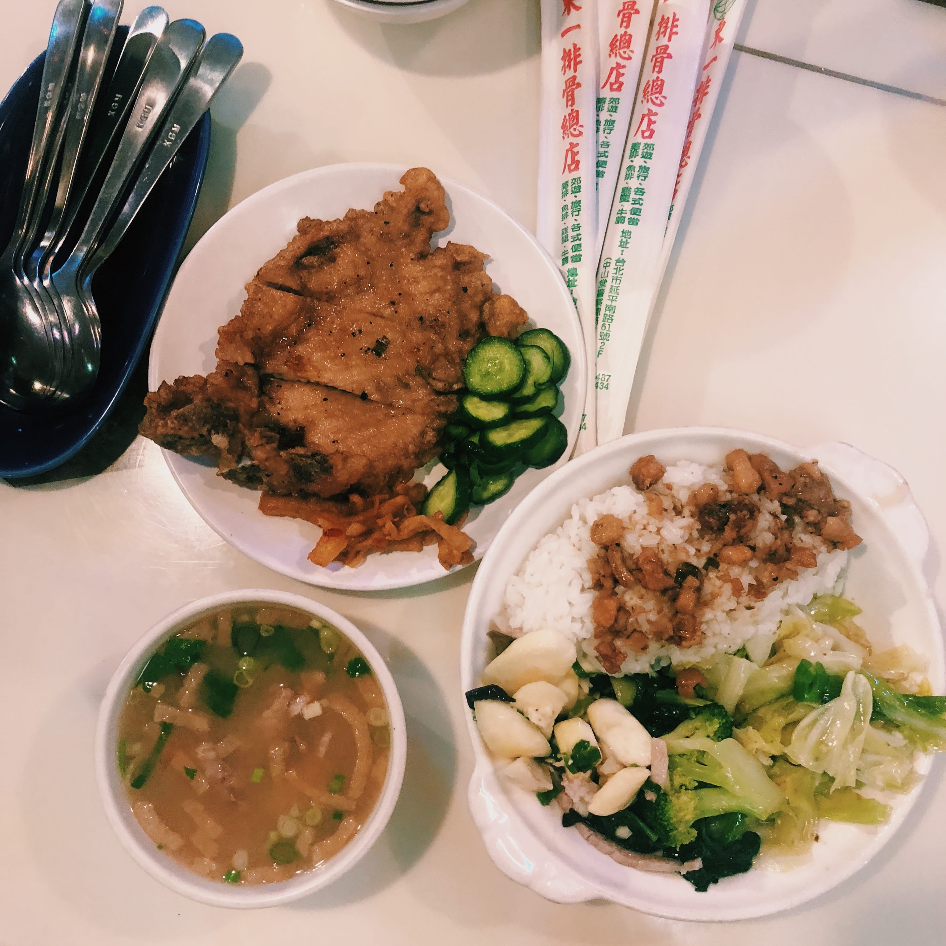 「排骨飯(パーコー飯)」目当てにやってきたのは「東一排骨總店」(湾台北延平南路61号2樓)。「排骨飯」とは台湾風のトンカツです。豚ロース肉を醤油風味のタレに漬け込み、片栗粉をまぶしてフライパンでカリッと焼いたもの。