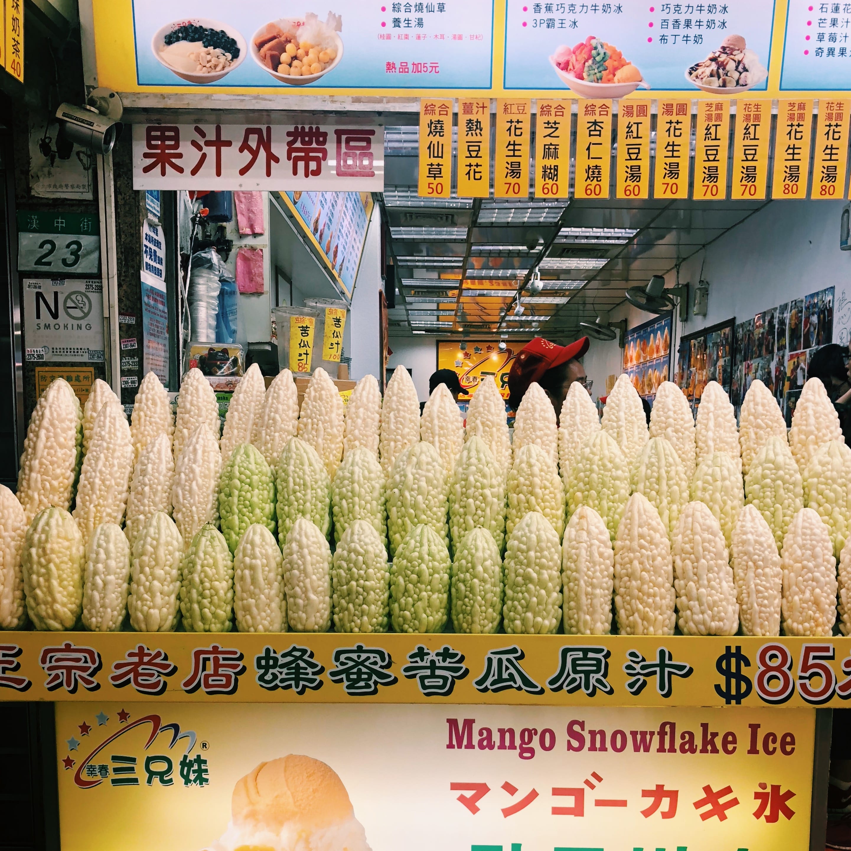 手に持っているのは、西門町の名物「蜂蜜苦瓜原汁(はちみつ入り白ゴーヤのフレッシュジュース)」。ゴーヤの苦味とはちみつの甘みによる不思議な味に頭が「?」でいっぱいに。でも思った以上に爽やかで飲みやすい。ビタミン、ミネラルも豊富で、間違いなく体に良さそう。