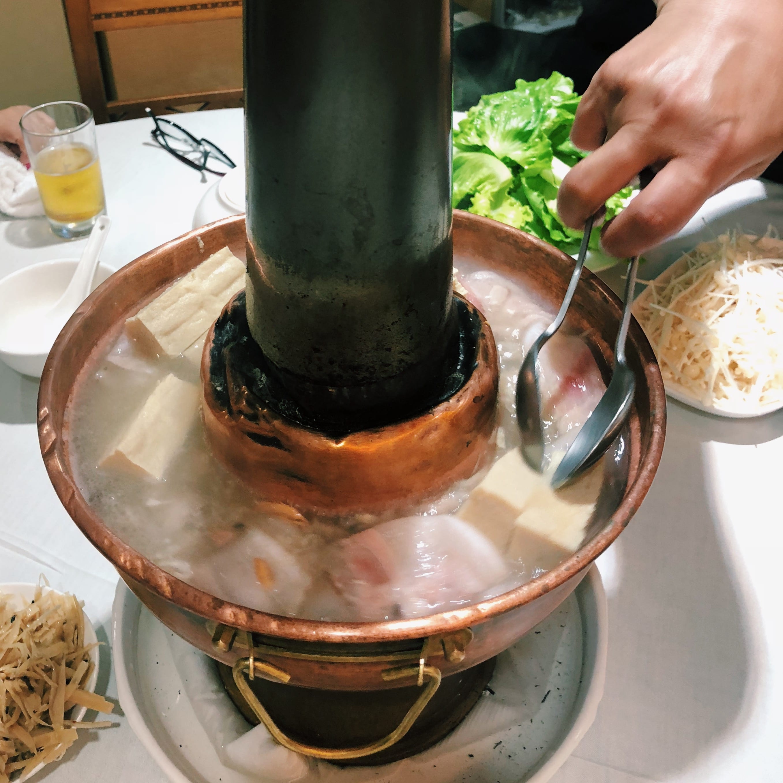 高級感ある門構え。仕事あがりのグループや家族連れで満員。予約していてよかった。「酸菜白肉鍋」とは発酵させた白菜の漬物(酸菜白)がたっぷり入った酸味のある豚肉鍋。日本ではなかなかこの味に出会うことはできません〜。