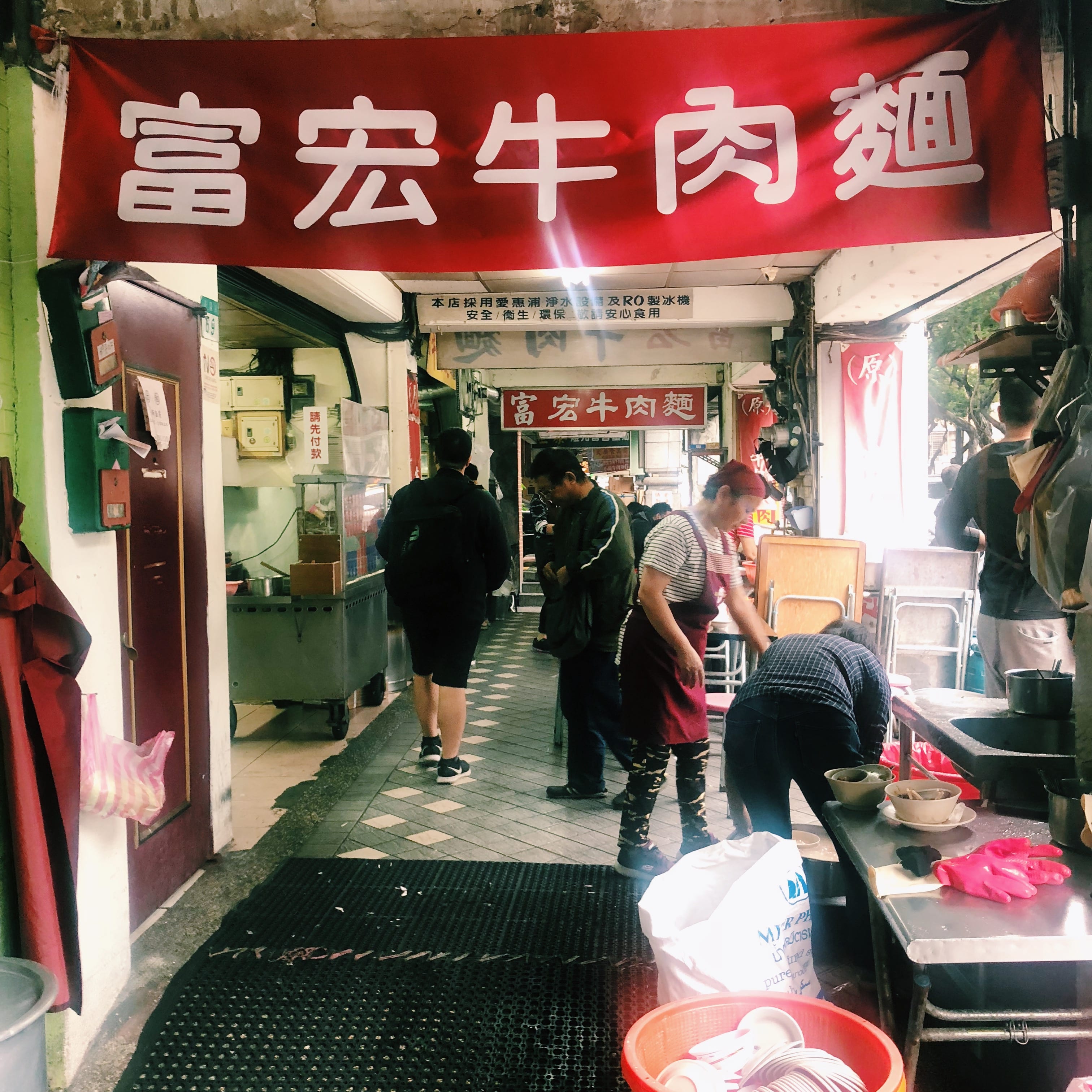 ここでやっと本当のランチタイム!台湾の国民食とも言える「牛肉麺(ニュウロウミェン)」を求めて「富宏牛肉麺」(台北市萬華区洛陽街69號)へ。24時間営業のお店。徒歩圏内ですが、先ほどいた西門町の繁華街から少し離れた場所にあります。