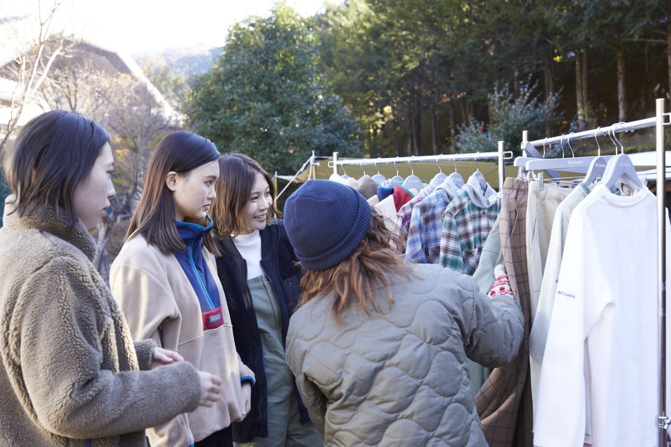 まずは、ファッションスナップに向けて、各自〈コロンビア〉の新作ウエアと私服をミックスコーディネート。デザインを手掛けたYURIEさん本人から丁寧にレクチャー&アドバイスを受けるという贅沢なひとときを過ごすことに。目移りしそうなぐらい素敵なアイテムに参加者からは「かわいい〜」の声が連発。まるで普段の買い物のような和気あいあいとしたムードは、底抜けに明るいYURIEさんの人柄が生み出すもの。