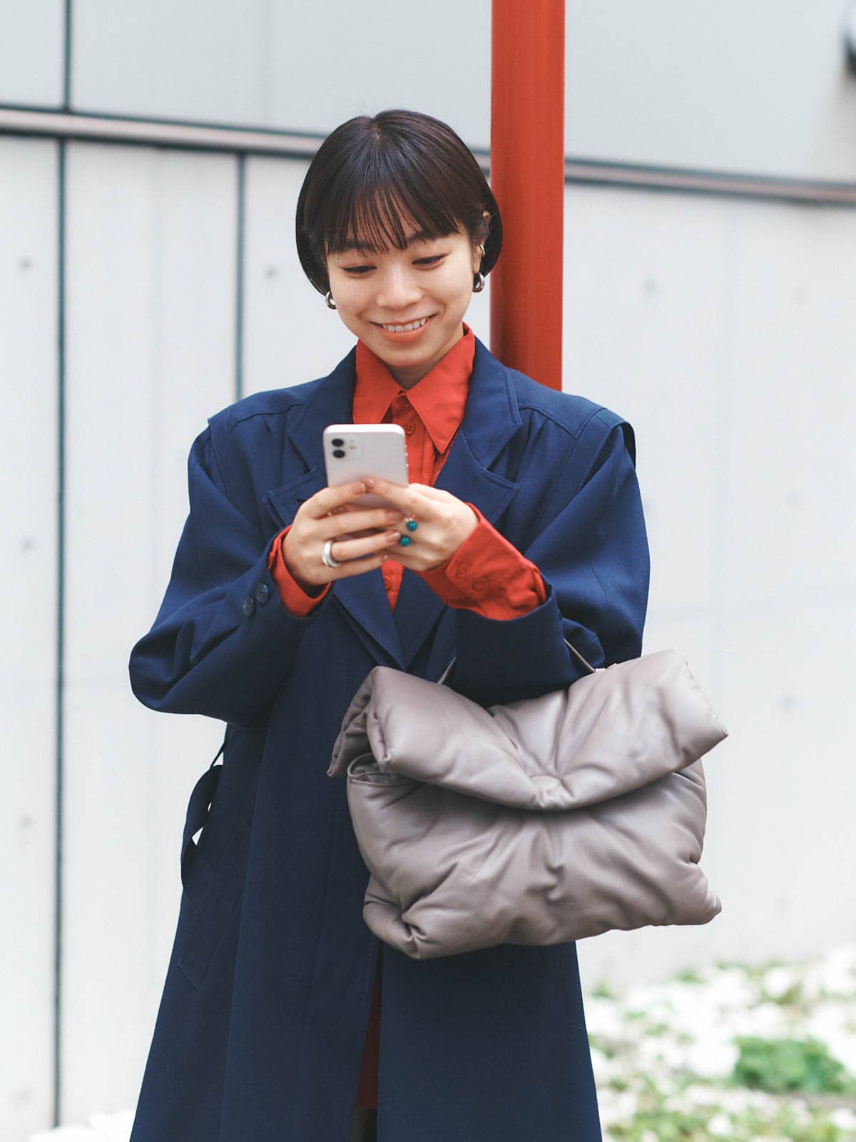 レザーの手袋をバッグにつけて、色味を足したのもポイント。「差し色の配分といったバランス感覚は、クオリティの高いヴィジュアルが次々流れてくるピンタレストで自然と吸収している部分もあるかも。私が好きそうな画像や動画をレコメンド機能が提案してくれて、自力では辿りつけない発想に出合えるのも魅力だなと思います」