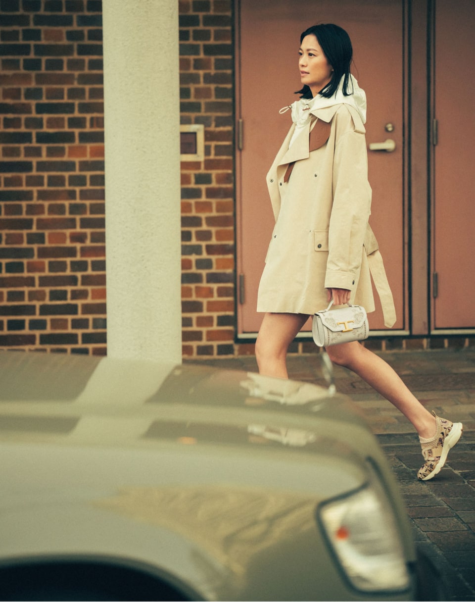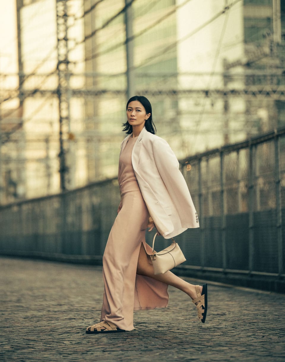 ヌード、ダスティベージュ、レンガ色。柔らかなニュートラルカラーに包まれて手には〈トッズ〉を象徴するバッグの数々。夕暮れどきに道ゆく人々の視線を惹きつける榮倉奈々さんの優雅でモダンな佇まい。