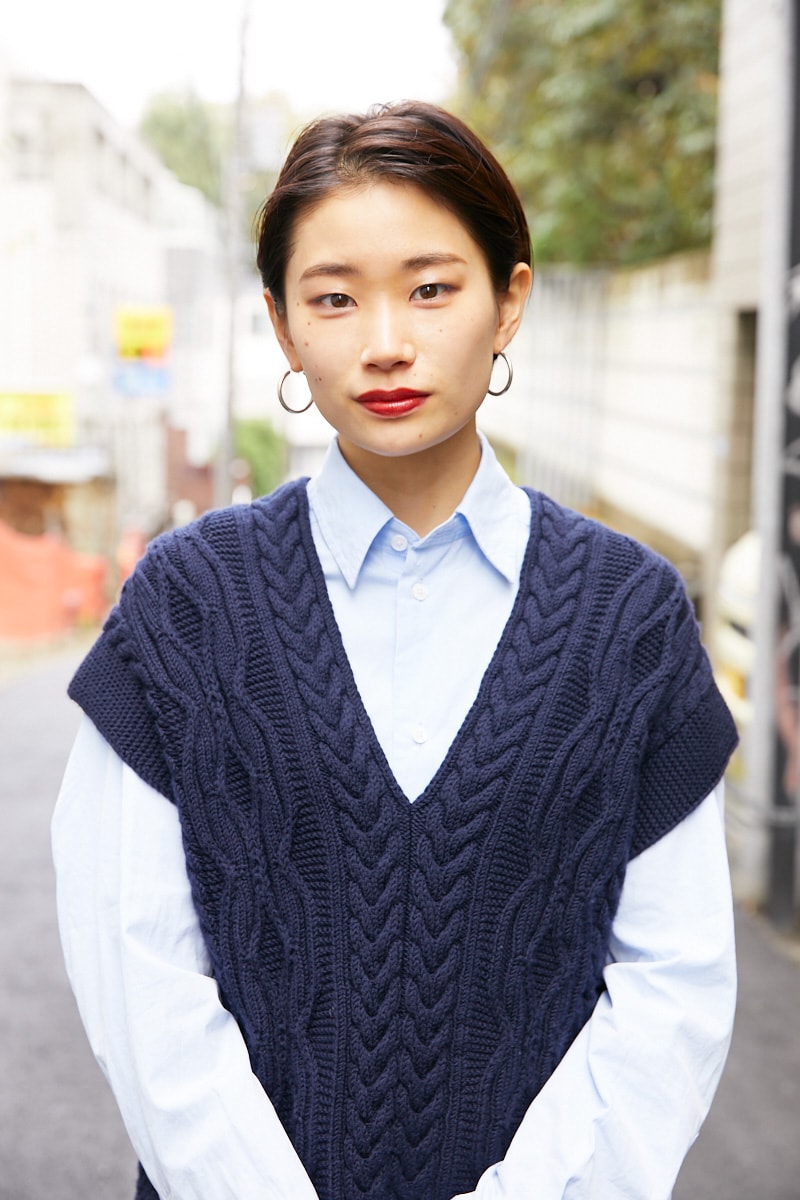 メンズライクなスタイルの中に、あえて赤リップをしました。シャツの襟のデザインやベストの横に入ったスリットなど、ちょっとしたディテールにポイントがある洋服が好きです。
