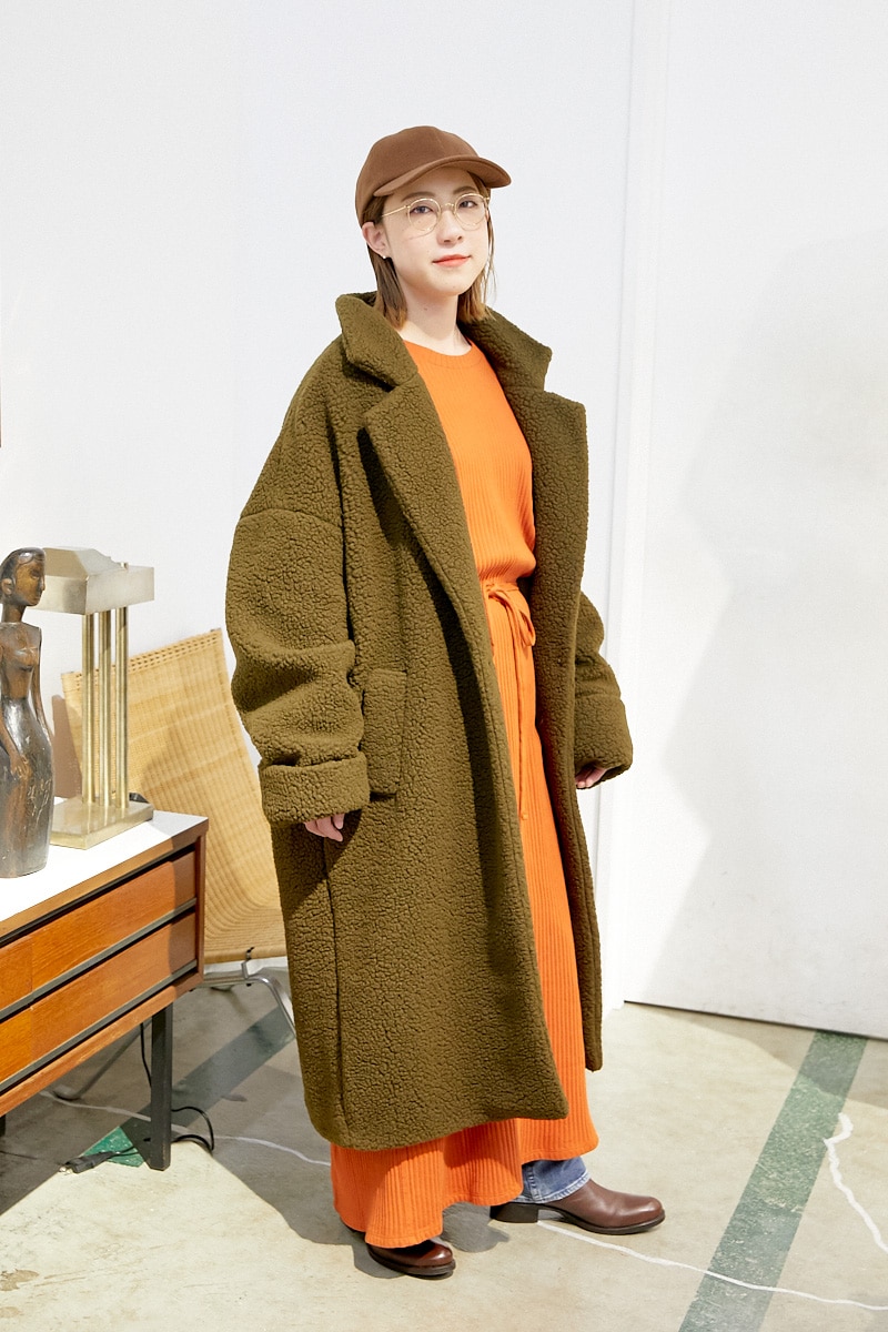 「BASERANGE(ベースレンジ)」の色が鮮やかなワンピースをメインに、全体的にアースカラーでまとめました。足元からデニムが覗かせて、カジュアルダウンしたのもポイント。