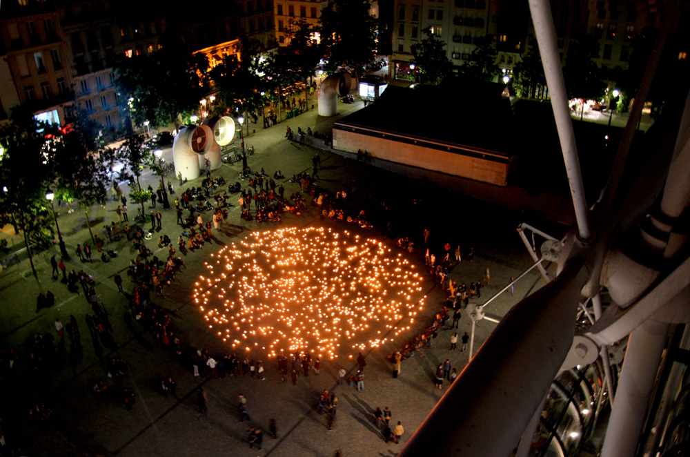 ビジュアル的に魅かれるのが、ルノー・オーギュスト=ドルムイユのインスタレーション。永久に輝く星と、人類の時間のはかなさを同時に表す1000本のキャンドルを用いて、100年後の天体図を描き出す作品。17時に点火され、キャンドルが燃えつきるまでの数時間、幽玄の美に浸りたい。