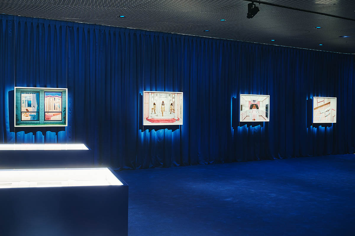 会場のプラダ 青山店 5Fは、濃いブルーに染まる。今回の展示のためにクリエイティブ・エージェンシー Random Studioが手がけた、光のインスタレーションだ。