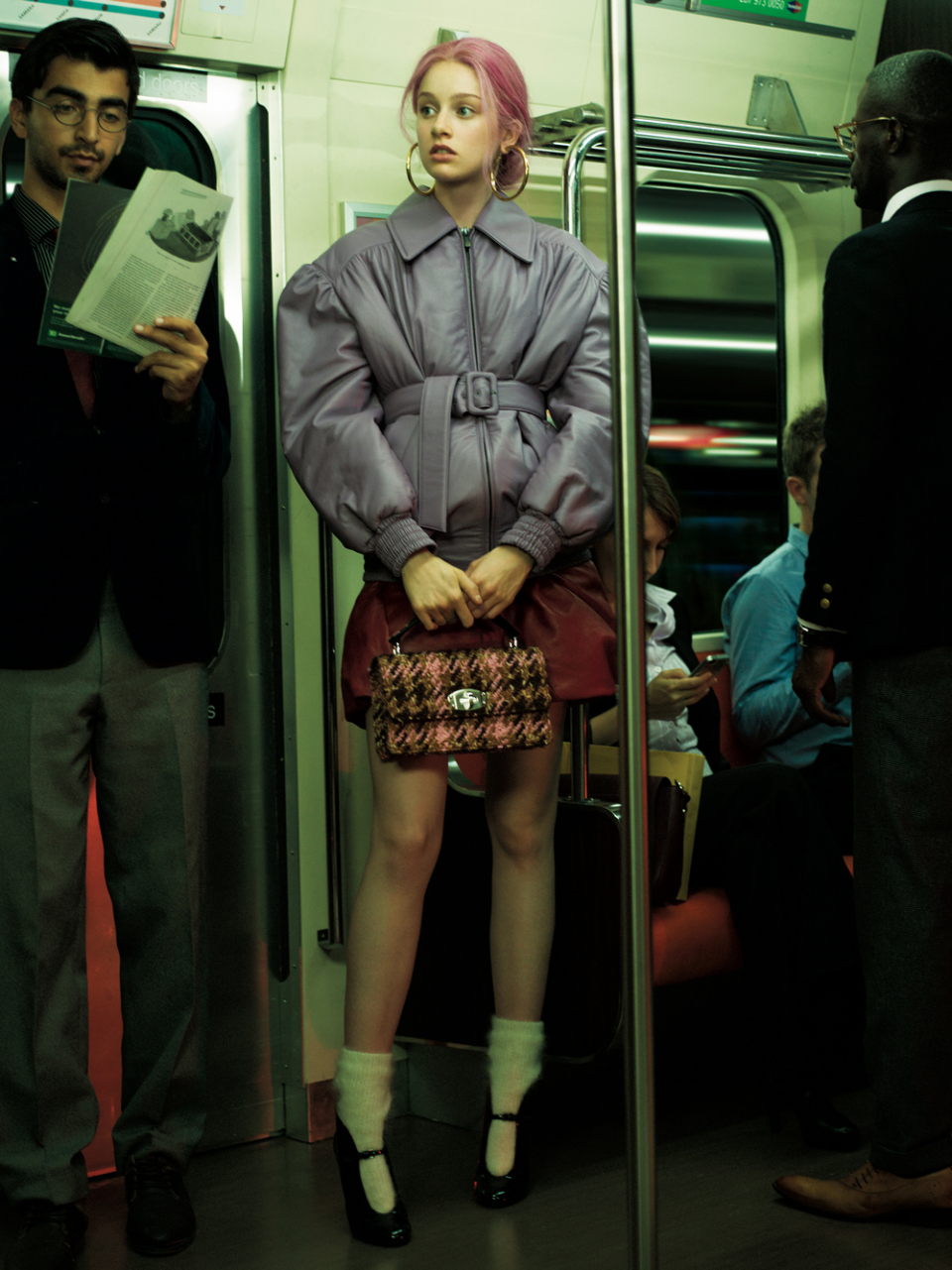 ナッパレザーのベルテッドダウンジャケット ¥459,000、ナッパレザーのバルーンスカート ¥246,000、モヘアソックス ¥25,000、パテントレザーのストラップブーティ ¥120,000、ツイードのハンドバッグ ¥182,000*すべて予定価格(以上ミュウミュウ │ ミュウミュウ クライアントサービス 0120-451-993)/フープピアス $795(ジェニファー フィッシャー)