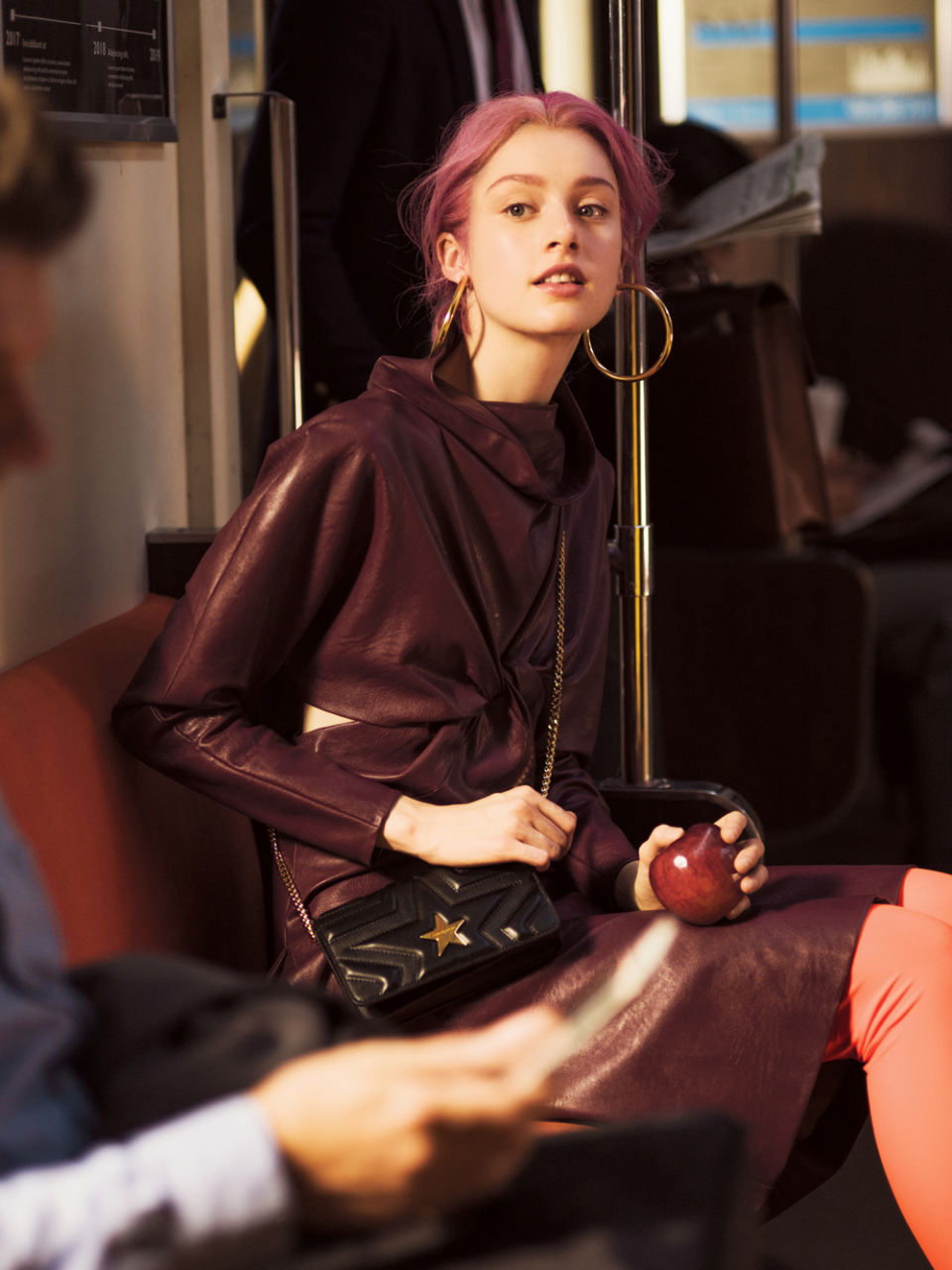 スキンフリースキンのハイネックドレス ¥162,000、ステラ スター フラップショルダーバッグ ¥122,000(共にステラ マッカートニー │ ステラ マッカートニー ジャパン 03-6427-3507)/フープピアス $795(ジェニファー フィッシャー)