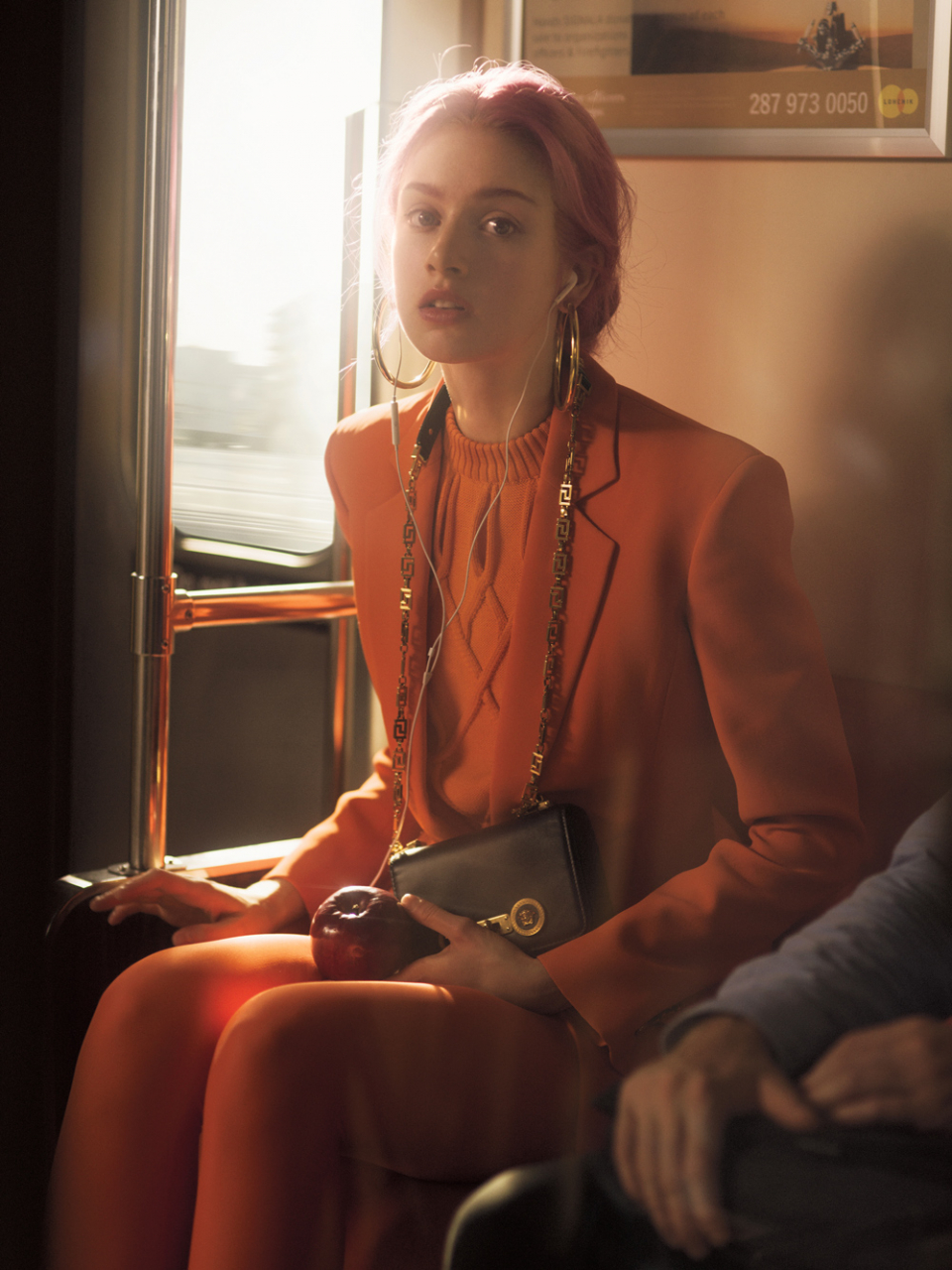 ウールの1ボタンシングルブレステッドジャケット ¥290,000、コットンニットのスリーブレストップ ¥73,000、中に着たボディ ¥40,000、スパンデックスのレギンスパンツ ¥33,000、カーフレザーのショルダーバッグ ¥201,000(以上ヴェルサーチ │ ヴェルサーチ ジャパン 03-3569-1611)/フープピアス $795(ジェニファー フィッシャー)