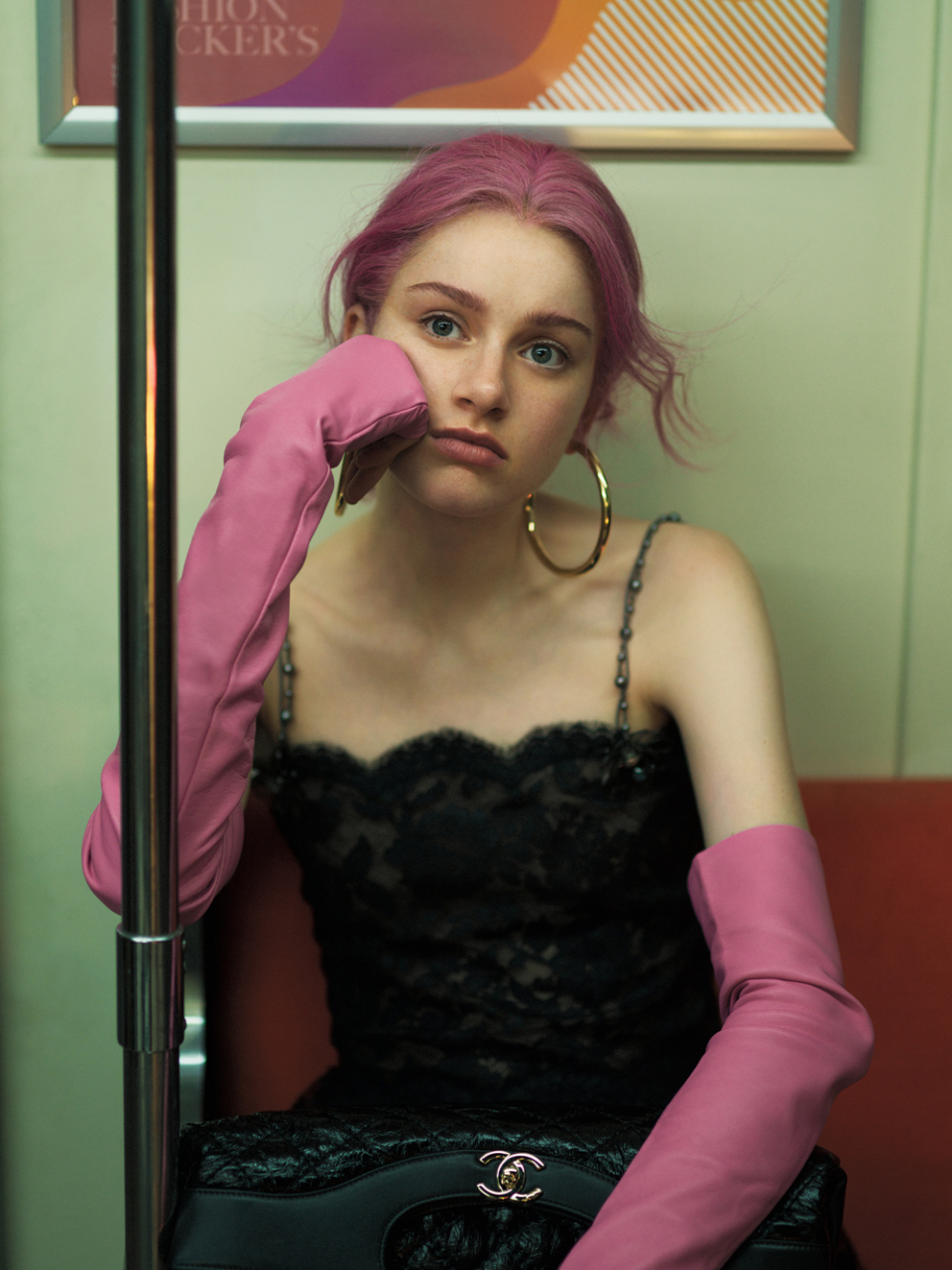 ビジューストラップのブラックドレス ¥1,060,000、ラムスキンのフィンガーレスグローブ ¥152,000、カーフスキンのバッグ 〈CHANEL 31〉¥438,000(以上シャネル │ シャネル カスタマーケア 0120-525-519)/フープピアス $795(ジェニファー フィッシャー)