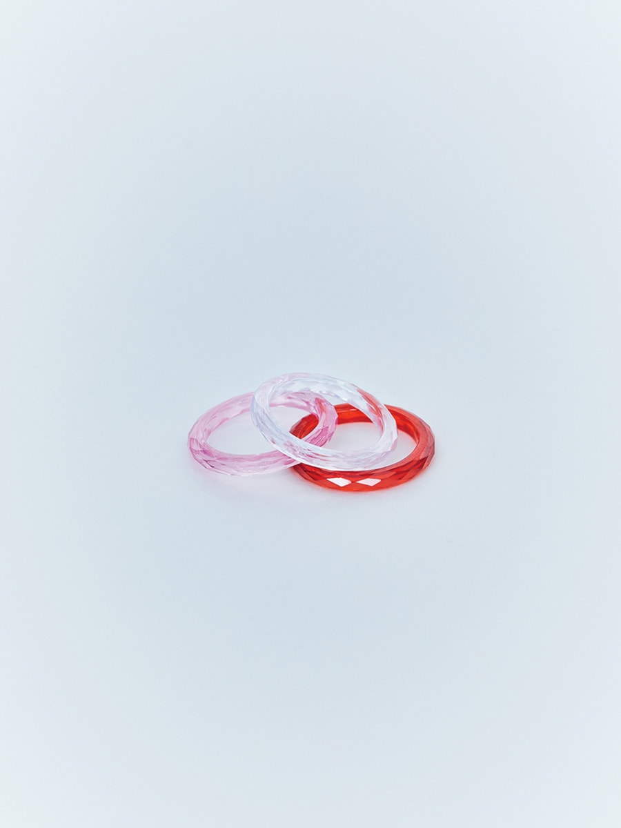 細かく入ったカッティングが無数の輝きを生み出す。1つだと無垢な印象に、重ねづけすればポップなサマーガールに!キュービックジルコニアリング 各¥3,700(ラニー)