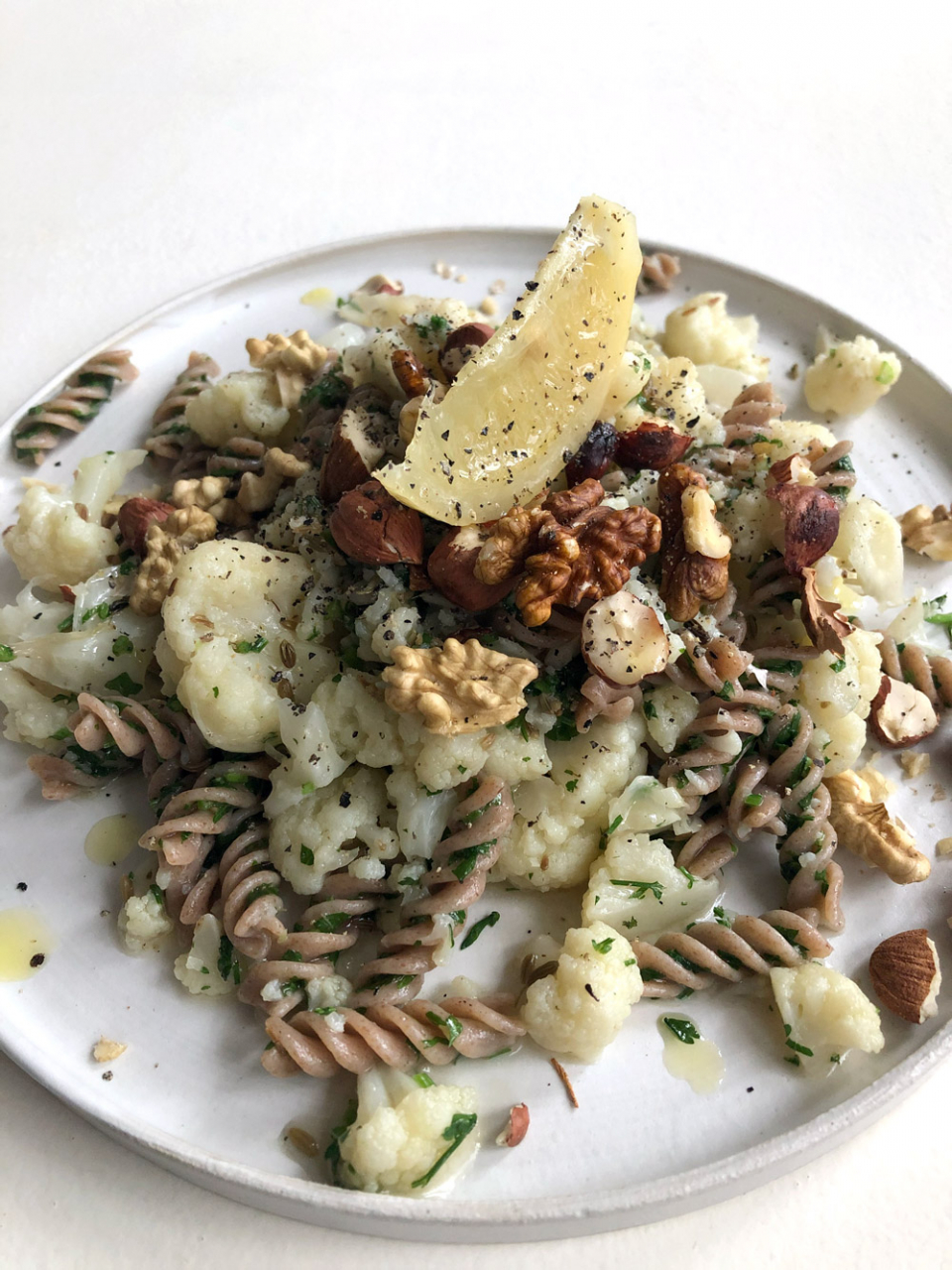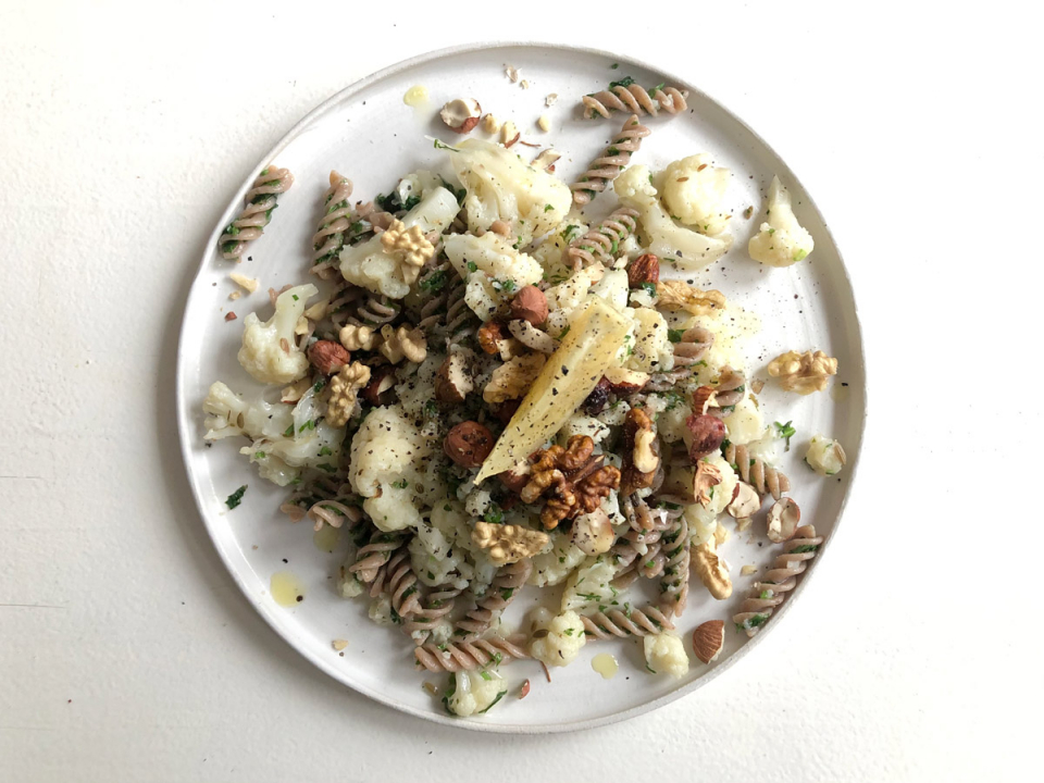 カリフラワーとナッツのパスタ 年末年始、キッチンがなにかと忙しいこの時期に。工程は5つ、たった10分でできる簡単なパスタ。あっさりと胃にも優しく、しっかり季節も感じつつ、華やかさもあります。