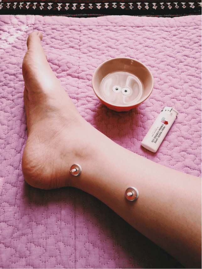 お灸ガイド本をひととおり読んだら、いよいよ実践してみましょう。準備するものは、台座灸、ライター、水(使用済みお灸の完全消火用)。手順としては、台座灸のもぐさ部分に火をつけて、好きなツボに貼るだけです。入浴や食事前後30分~1時間は避けた方がいいようです。