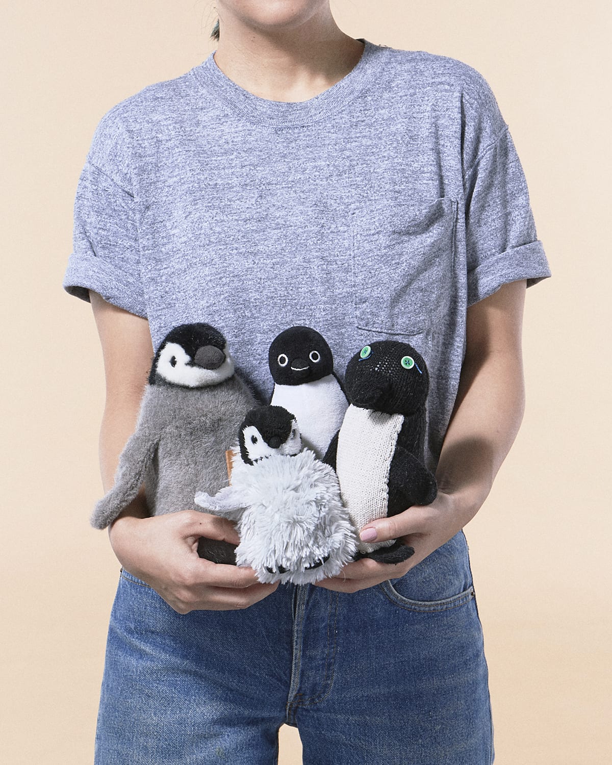 実家から今の家にたくさんのぬいぐるみ達と引っ越した時に、パートナーから「なんかペンギンばっかりじゃない?」と言われたのが事の発端。全く自覚がなかったのですがそれから妙に意識するようになりペンギンの虜に…でもペンギンだからどれでもいい訳ではなく、フォルムと表情(特に目)、白・黒・グレーだけで完結にまとめられていること。部屋で一緒に過ごすのでインテリアの邪魔にならないという点も選ぶポイントになります。ちなみに目がボタンになっているヤツはいとこのぬいぐるみ作家金森美也子さんのワークショップで、2色の軍手を使って作りました!