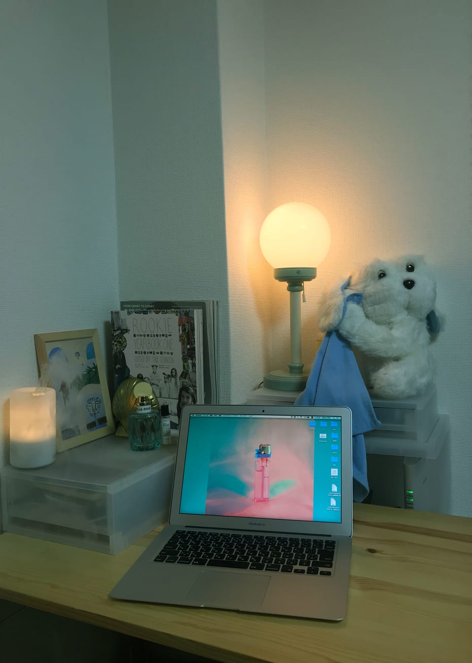 作業デスクは引越しの後、慌てて買った無印の机。特に何でもないところがお気に入り。蛍光灯が苦手なので、部屋のいたるところに間接照明を置いている。