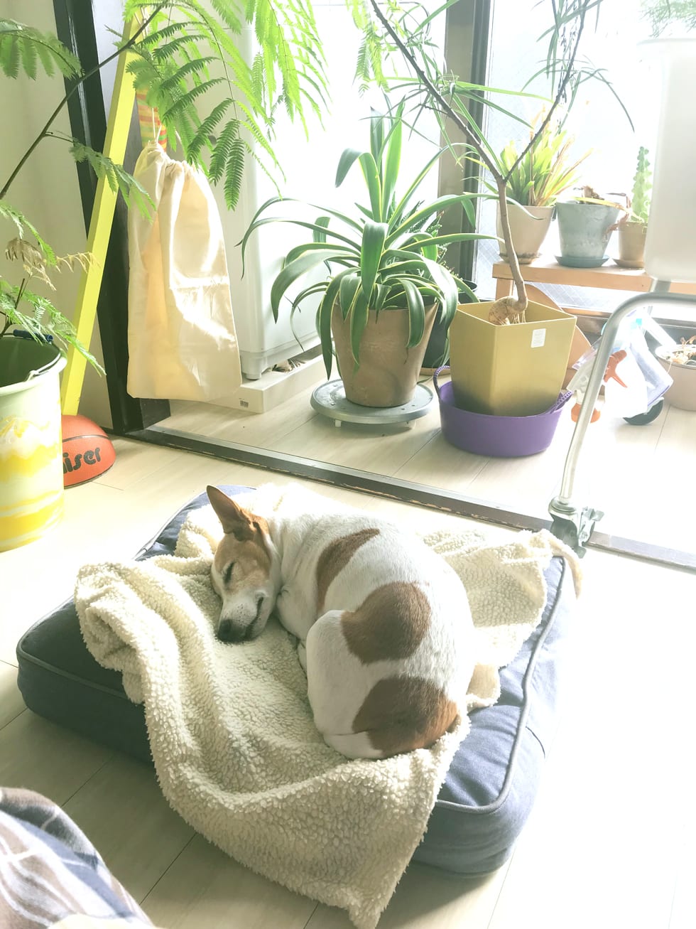 ワンルームは仕切りなど遮るものが何も無いので、抜け感が気持ち良い。時々実家からおじいちゃん犬がステイしに来るけれど、日なたが大好きらしくここでずっと寝ている。