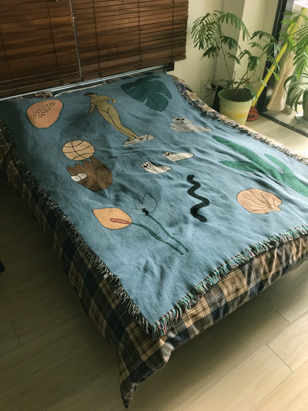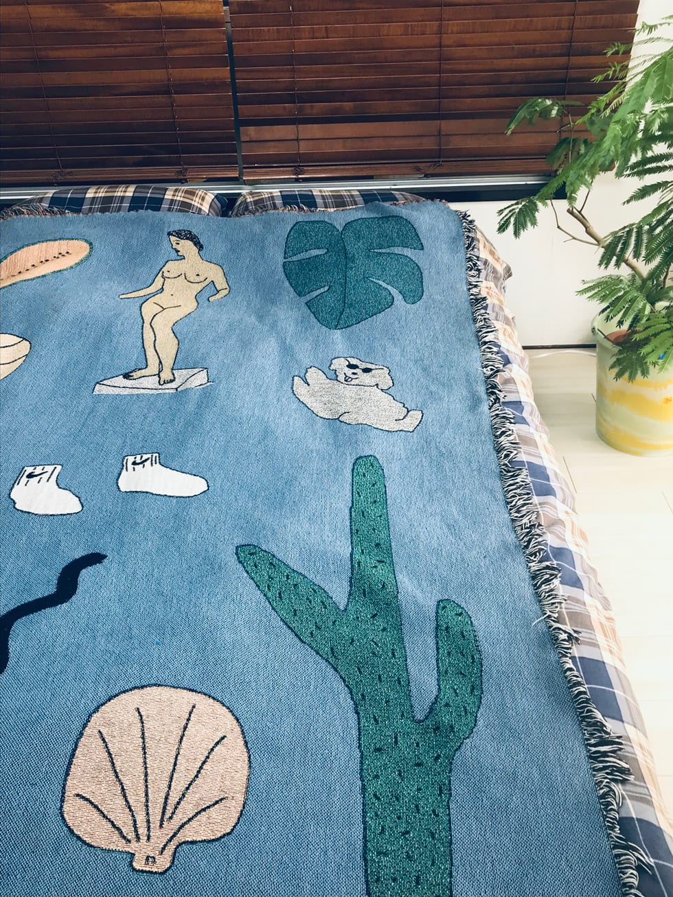 ずっと買おうか悩んでいた、L.A.ブランド〈bfgf〉のブランケット。クリエイター Lilian Martinezがcommuneに来日した際に購入。グッときたものは、迷ってもやっぱり買ってしまう。ワンルームで全てが見えてしまうのでベットカバーとして使用中。